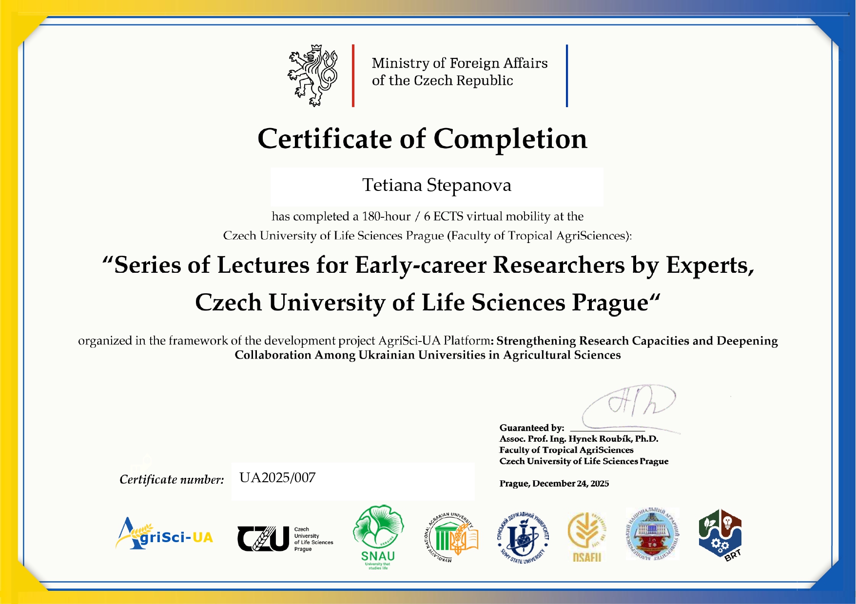 Доцент Степанова Тетяна Михайлівна успішно пройшла підвищення кваліфікації обсягом 180 годин академічної мобільності у Чеському університеті наук про життя у Празі (Czech University of Life Sciences Prague). Сертифікат.
