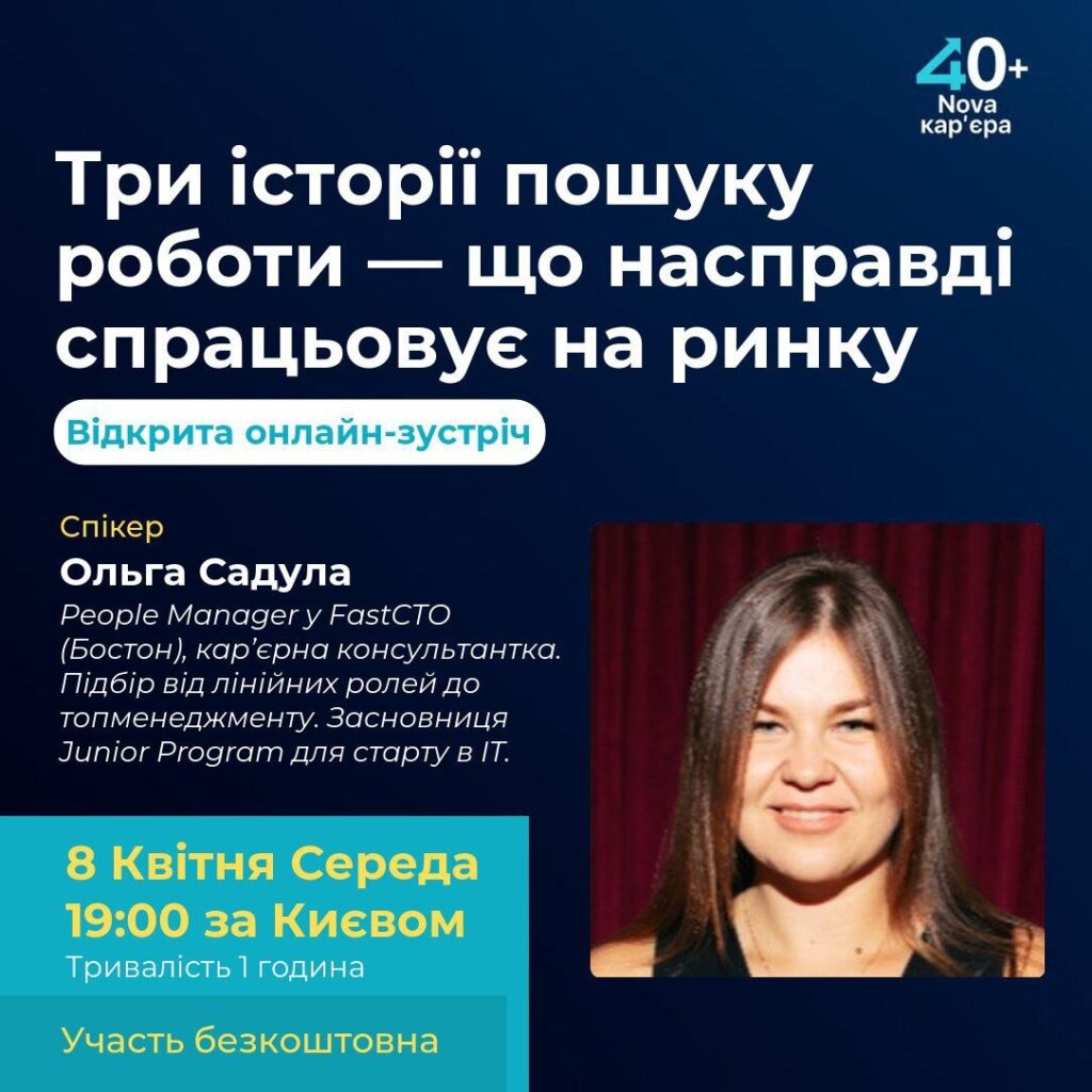 🎤 Спікерка: Ольга Садула – People Manager бостонської ІТ-компанії FastCTO, кар’єрна консультантка, з досвідом підбору фахівців від лінійних ролей до топменеджменту в ІТ, фінансах, логістиці, маркетингу та HoReCa. Засновниця Junior Program, авторка каналу про ринок праці і пошук роботи https://www.youtube.com/@OlhaSadula