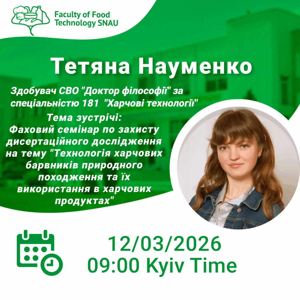 📢Фаховий семінар по захисту дисертаційного дослідження на тему “Технологія харчових барвників природного походження та їх використання в харчових продуктах”