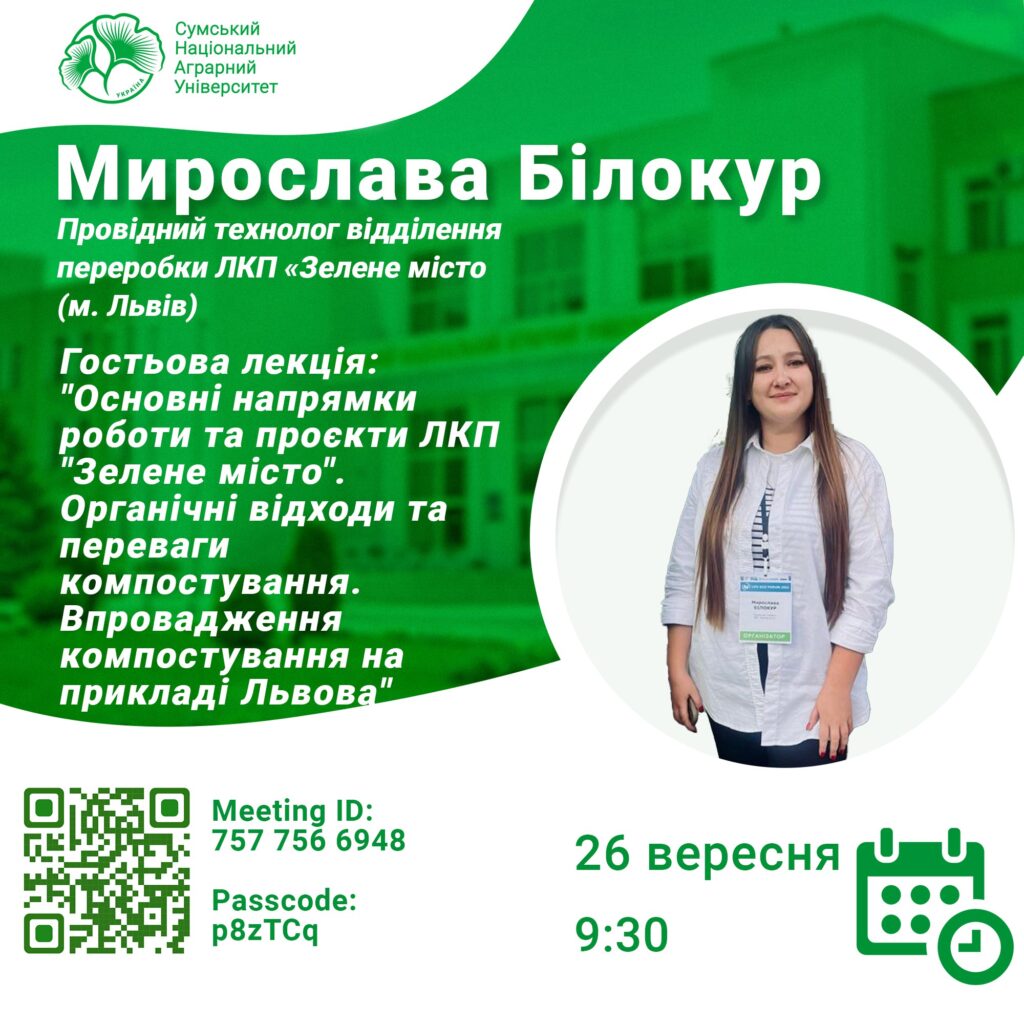 Факультет харчових технологій запрошує на онлайн-зустріч із Мирославою Білокур – провідною технологинею відділення переробки ЛКП «Зелене місто» (м. Львів).