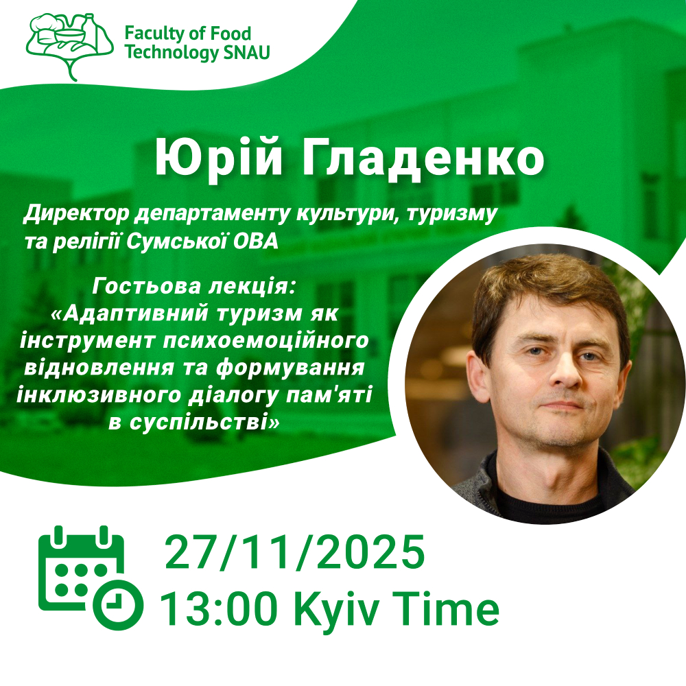 Факультет харчових технологій запрошує на гостьову лекцію з Юрієм Гладенком – директором департаменту культури, туризму та релігії Сумської ОВА.