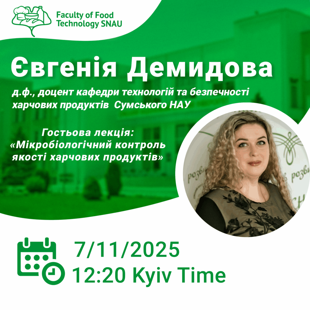 Факультет харчових технологій запрошує на онлайн-лекцію з Євгенією Демидовою – доктором філософії, доцентом кафедри технологій та безпечності харчових продуктів Сумського НАУ.