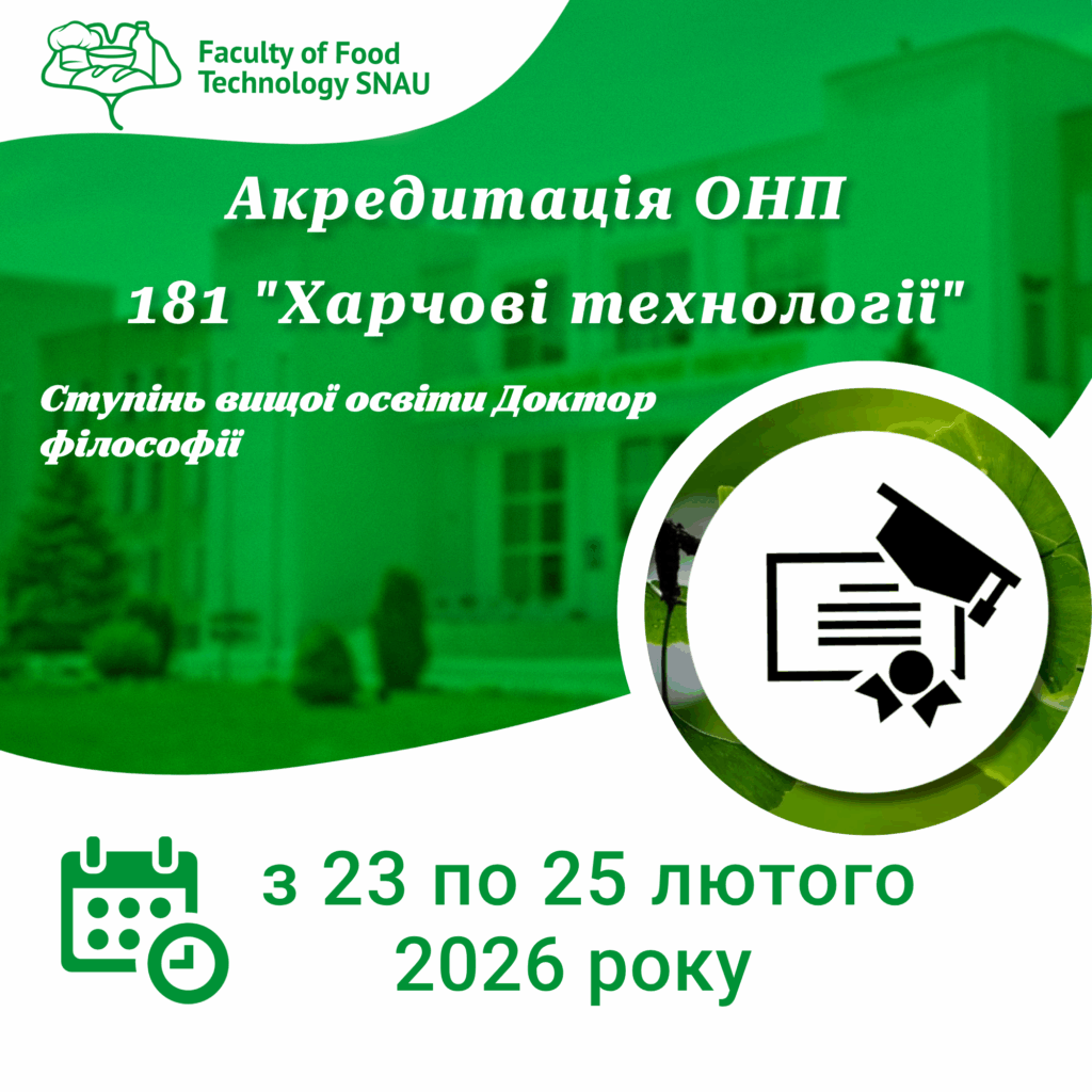 Повідомляємо, що у період з 23 по 25 лютого 2026 року відбудеться акредитація освітньо-наукової програми зі спеціальності 181 «Харчові технології» третього (освітньо-наукового) рівня вищої освіти – Доктор філософії (PhD).