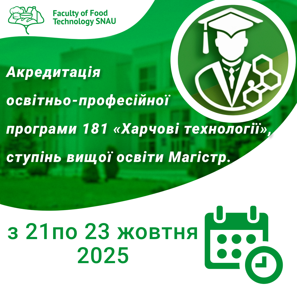 З 21 по 23 жовтня 2025 року відбудеться акредитація освітньо-професійної програми 181 «Харчові технології», ступінь вищої освіти Магістр.