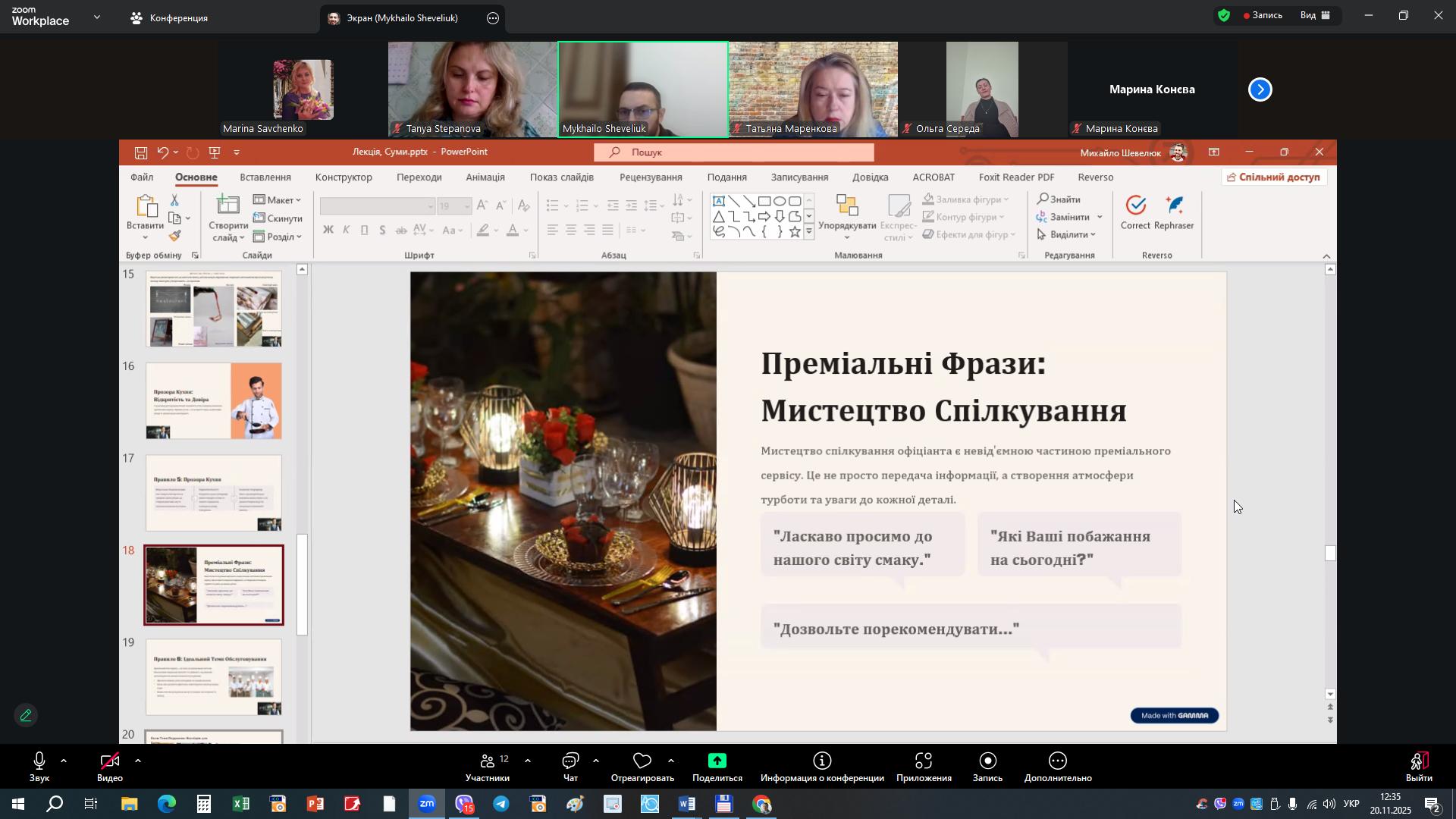 Гостьова лекція Михайла Шевелюка для здобувачів факультету харчових технологій, відбулася 20 листопада 2025 року у форматі онлайн Zoom-конференції та зібрала значну аудиторію студентів, зацікавлених у сучасних підходах до сервісу й розвитку готельно-ресторанного бізнесу. Михайло Шевелюк – керівник Української Школи Гостинності, доктор філософії з культурології та менеджер провідних львівських закладів – поділився практичними інструментами та досвідом у межах лекції «10 правил гостинності, які піднімуть будь-який заклад на рівень преміум».