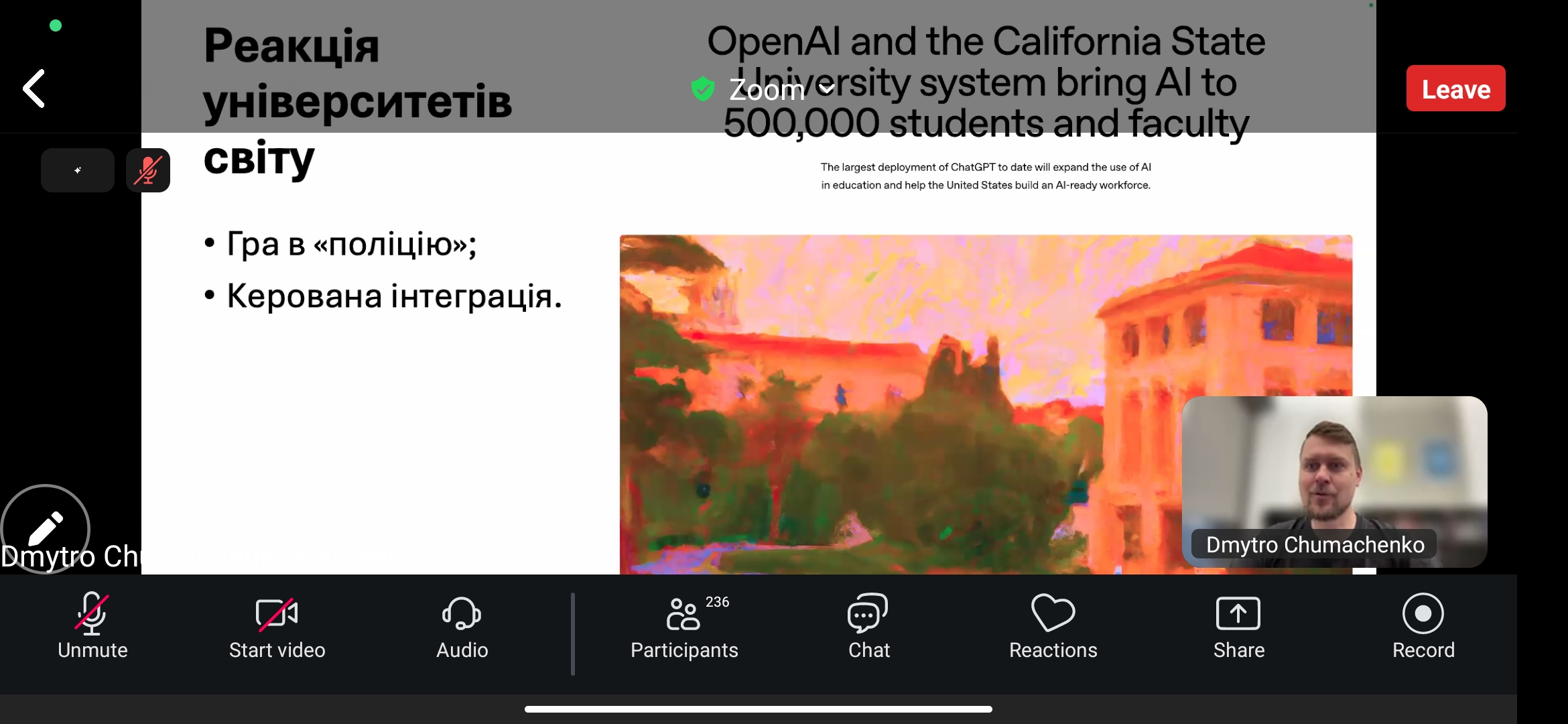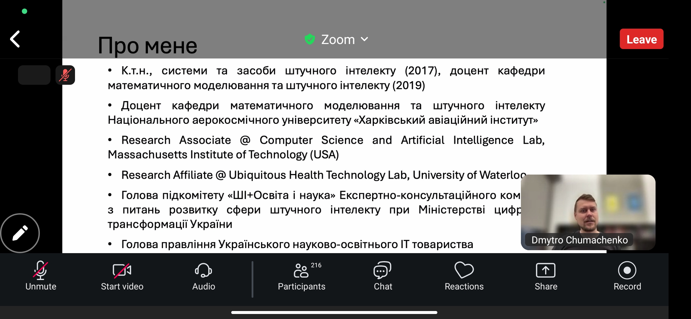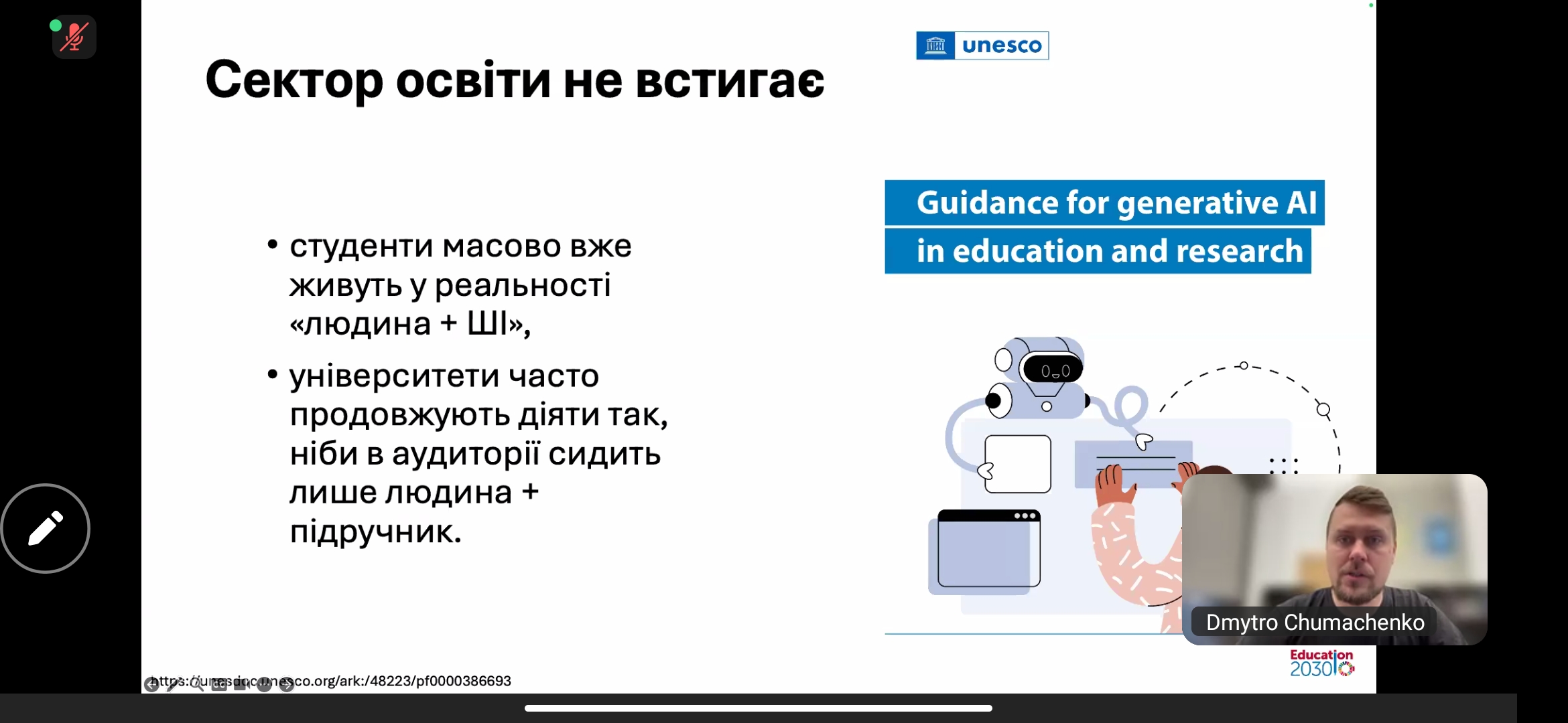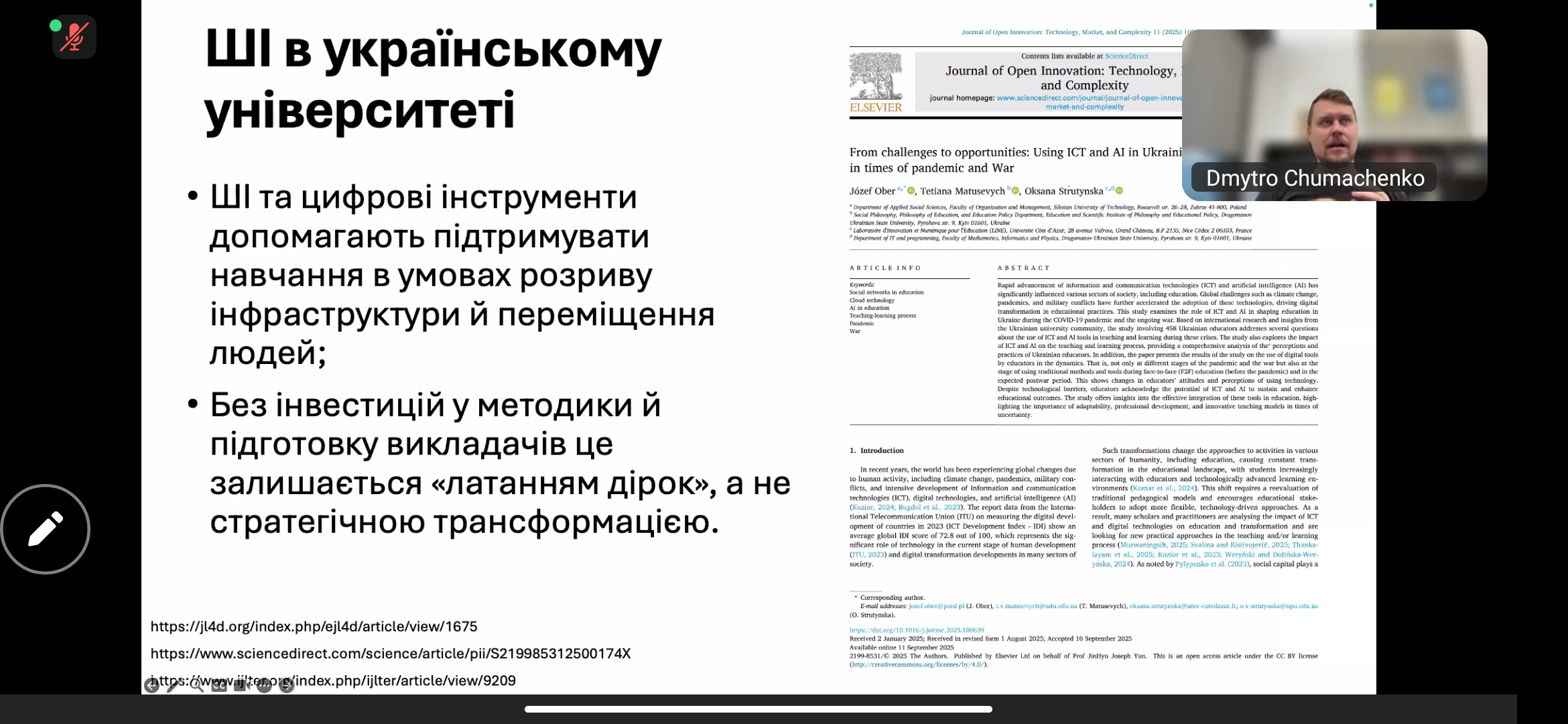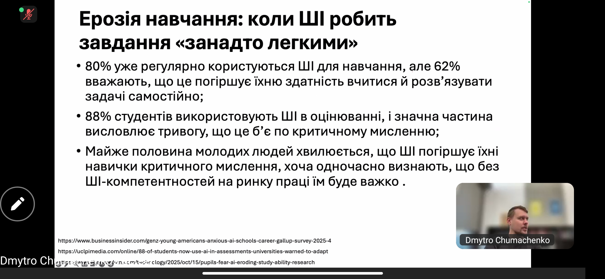 24 листопада 2025 року в межах Тижня академічної доброчесності в Сумському НАУ відбулася відкрита онлайн-доповідь Дмитра Чумаченка на тему: «Оновлення триває… Чи встигне вища освіта за штучним інтелектом?»