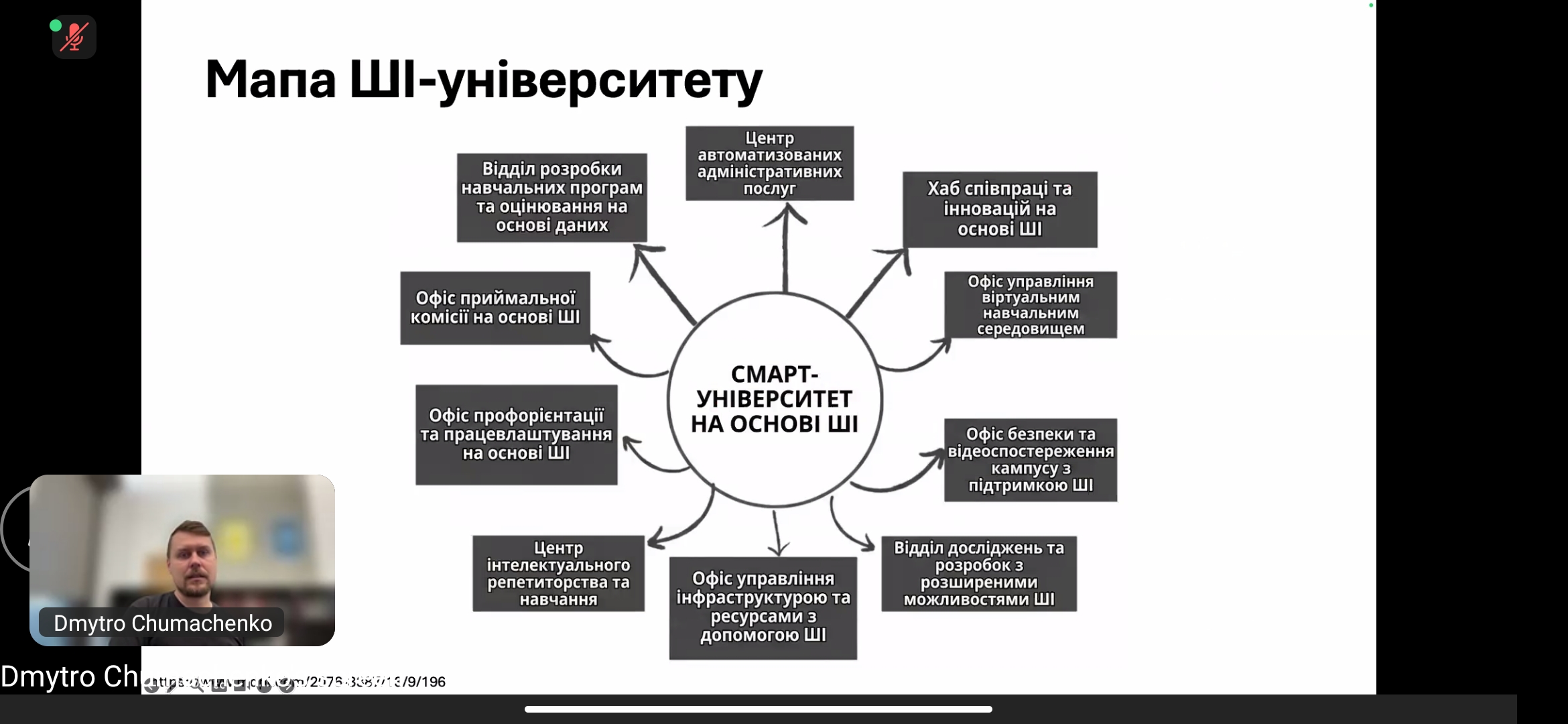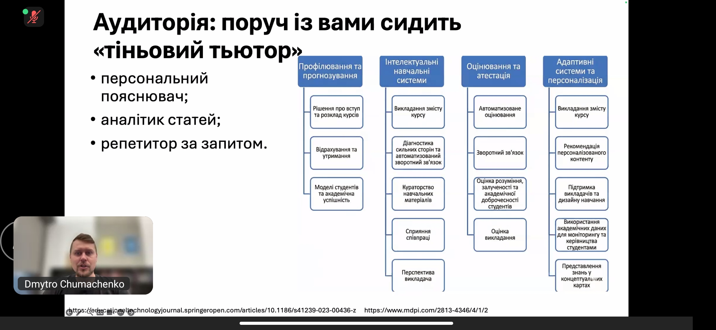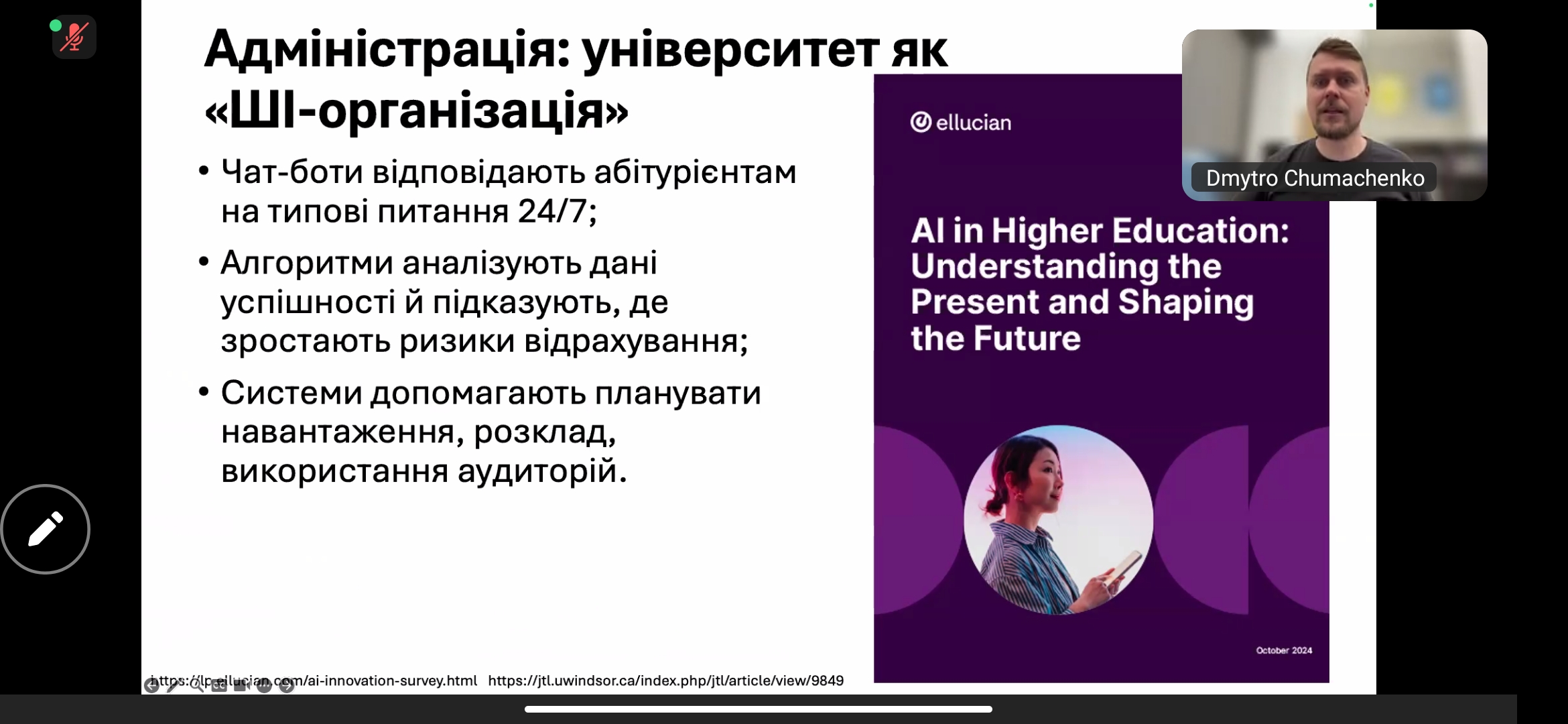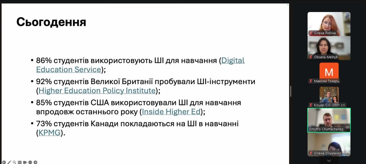 Під час доповіді було висвітлено ключові аспекти впливу штучного інтелекту на сучасну систему вищої освіти, зокрема: