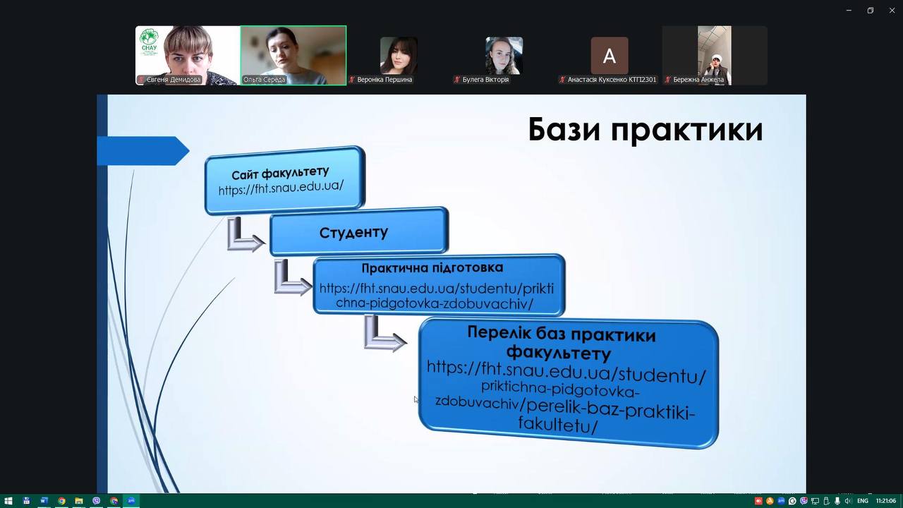 Зокрема, для студентів бакалаврського рівня обговорювалися вимоги до оформлення документів з виробничої практики, тоді як для здобувачів другого (магістерського) рівня — ключові аспекти підготовки та супроводу професійної практики.