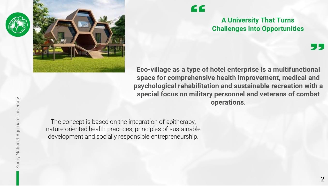 Проєкт “Eco-village with an apitherapeutic profile as a model of sustainable health and rehabilitation space” отримав високу оцінку журі та став яскравим прикладом сучасного бачення розвитку сфери гостинності, поєднаного з ідеями сталого розвитку та оздоровчого туризму