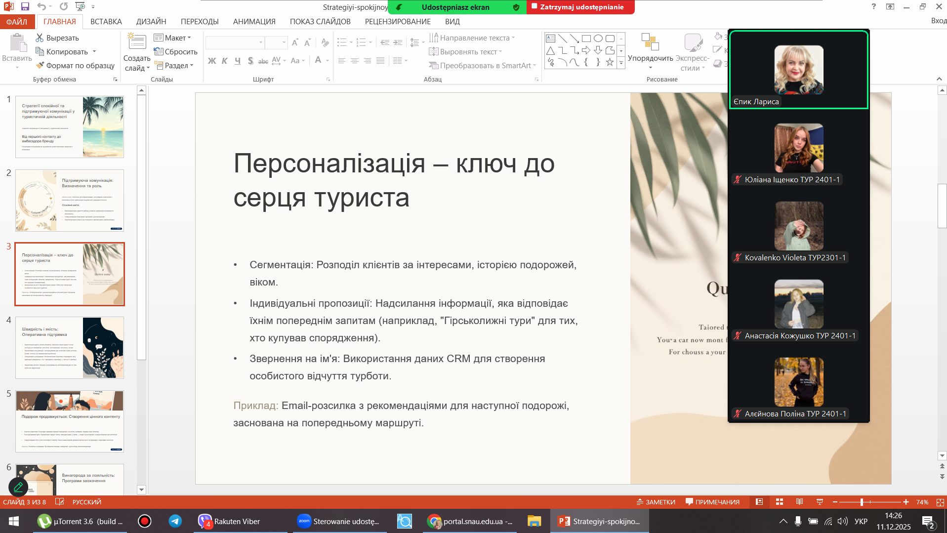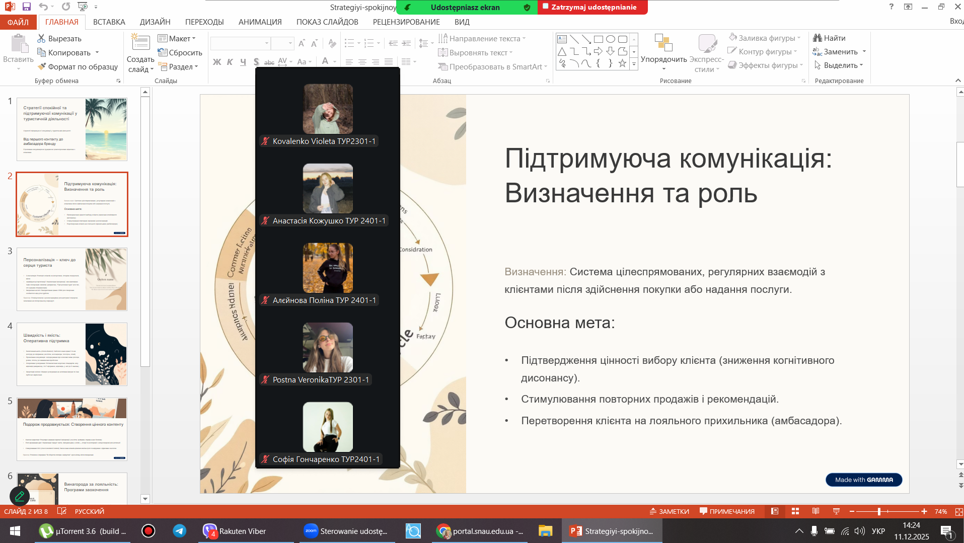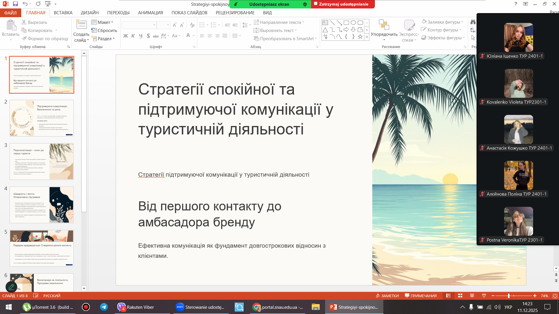 11 грудня 2025 року відбулося чергове засідання гуртка, присвячене надзвичайно актуальній темі: «Стратегії спокійної та підтримуючої комунікації в туристичній діяльності».