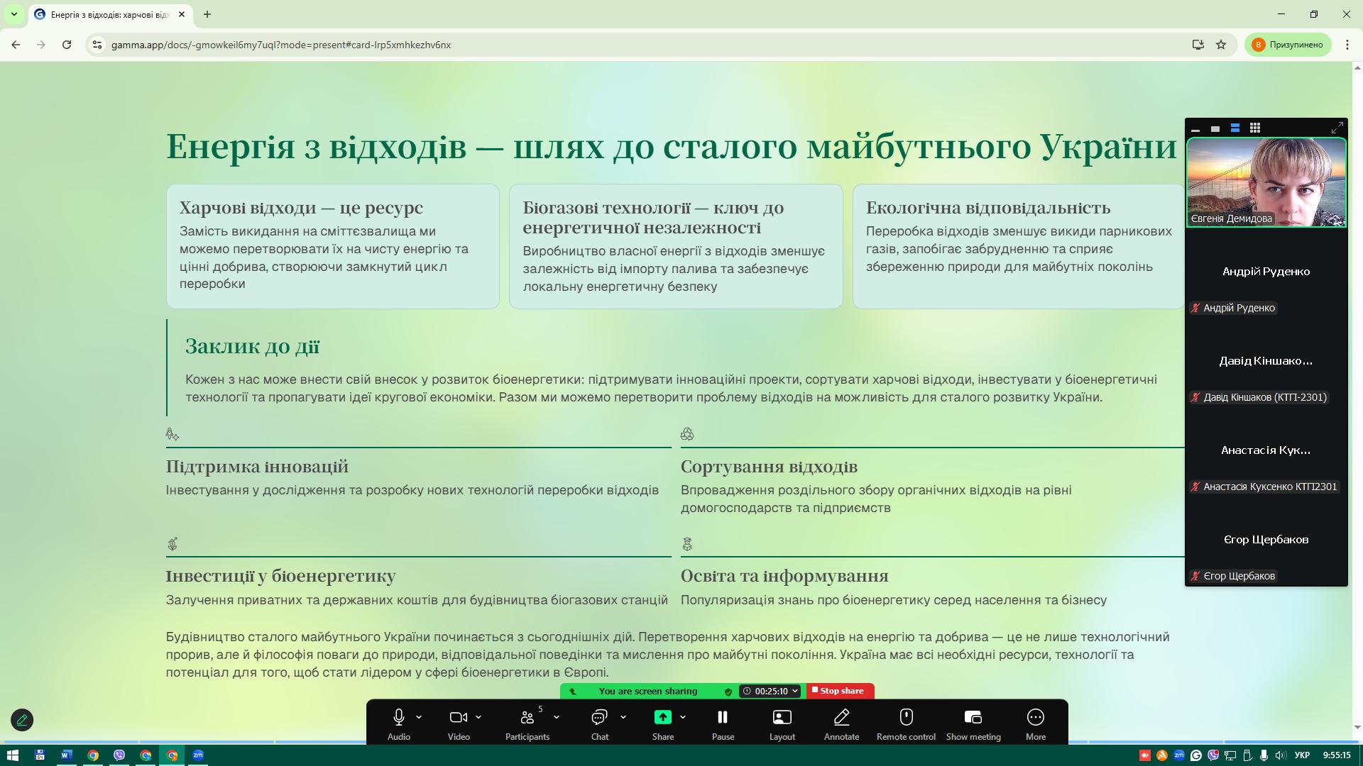 У ході роботи гуртка розглянули технологію отримання біогазу з органічної сировини, особливості анаеробного зброджування та перспективи використання біогазу як альтернативного джерела енергії. Також учасники ознайомилися з можливостями перероблення харчових залишків у органічні добрива, що сприяє зменшенню кількості відходів та підвищенню родючості ґрунтів.