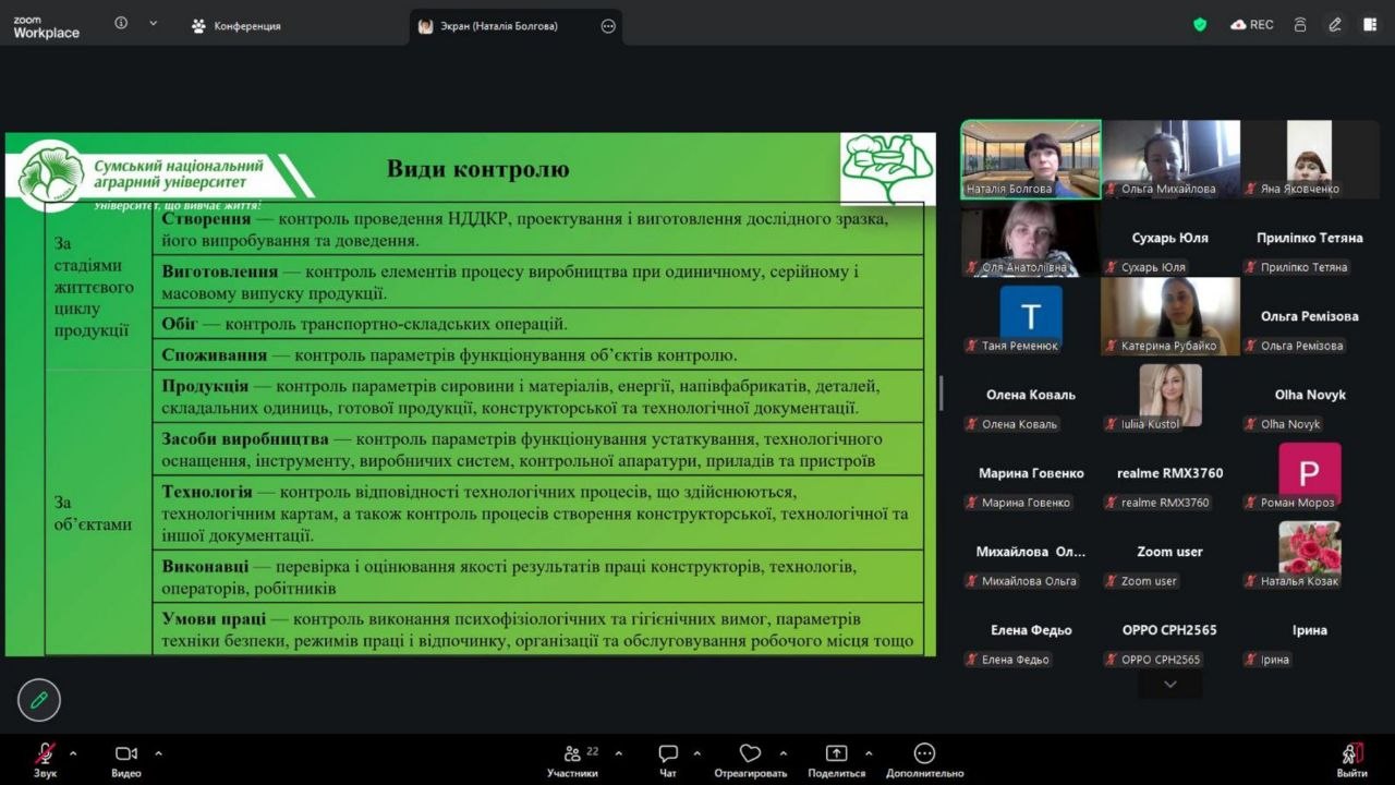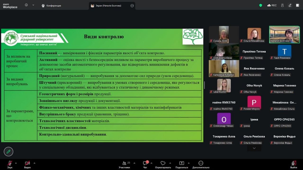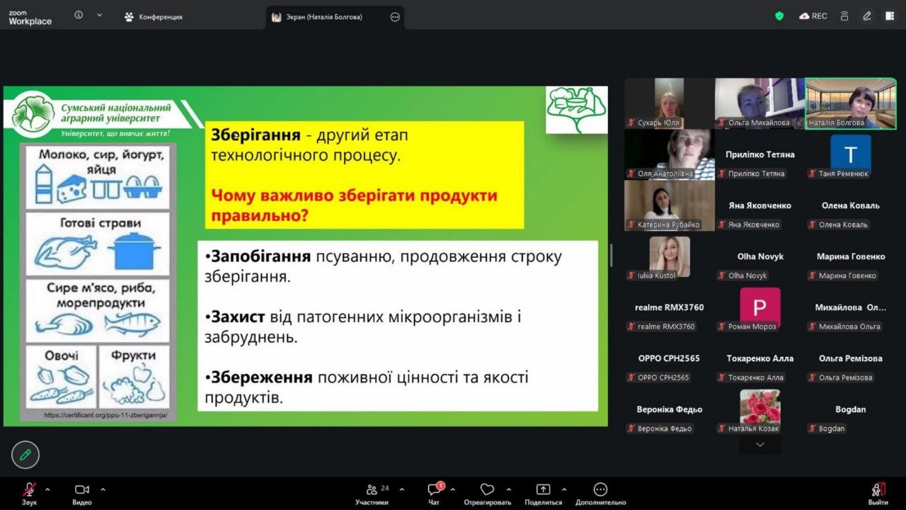 У межах навчання групи учасників курсу з розробки та впровадження системи HACCP (01–30 квітня 2026 року) доцент кафедри технологій та безпечності харчових продуктів Наталія Болгова провела лекційне заняття на тему «Особливості контролю технологічних процесів і постачальників на харчових виробництвах».