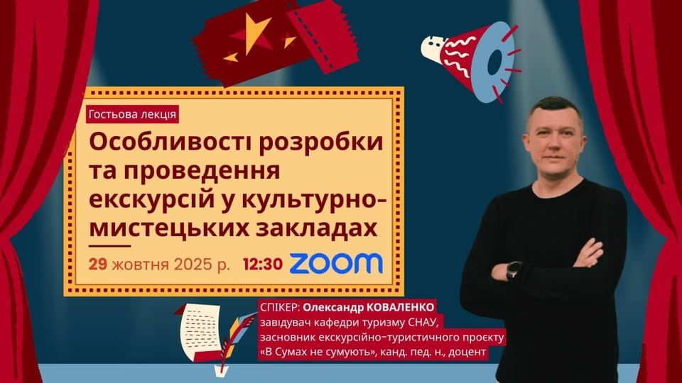 29 жовтня 2025 року відбулася надзвичайно цікава онлайн-лекція для студентів спеціальності 242 Туризм і рекреація, студентів ВСП “Путивльський фаховий коледж СНАУ” та всіх бажаючих на тему «Особливості розробки та проведення екскурсій у культурно-мистецьких закладах».