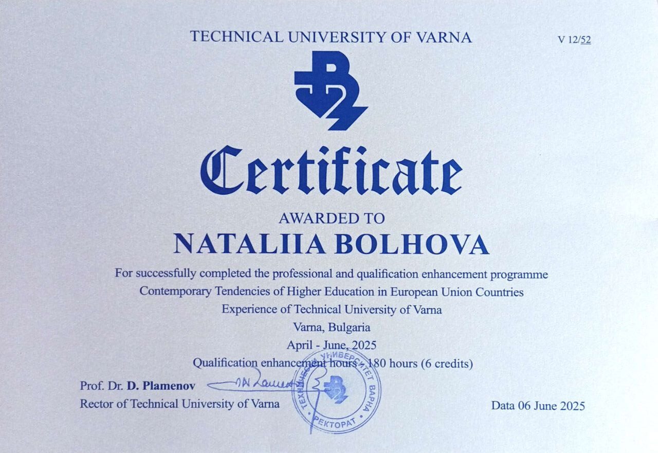 22. TECHNICAL UNIVERSITY OF VARNA, Varna, Bulgaria, certificate № V 12/5, topic «Contemporary Tendencies of Higher Education in European Union Countries Experience of Technical University of Varna», April-June 2025, Qualification enhancement hours – 180 hours (6 credits)