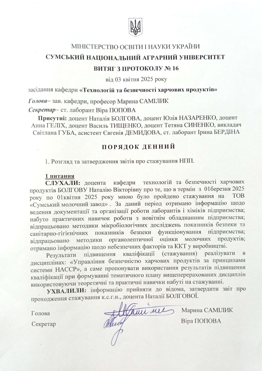 ВИТЯГ ПРО РОЗГЛЯД ТА ЗАТВЕРДЖЕННЯ ЗВІТІВ ПРО СТАЖУВАННЯ НПП