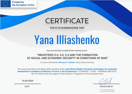 - Пройшла курс навчання «ГАЛУЗІ 3.0, 4.0, 5.0 ТА ФОРМУВАННЯ СОЦІАЛЬНО-ЕКОНОМІЧНОЇ БЕЗПЕКИ В УМОВАХ ВІЙНИ» в рамках модуля Жана Моне “Disruptve technologies for sustainable development in conditions of Industries 4.0 and 5.0: the EU Experience” (101083435 – DTSDI – ERASMUS-JMO-2022-HEI-TCH-RSCH). 04.04.2024р. та 09.04.2024р.