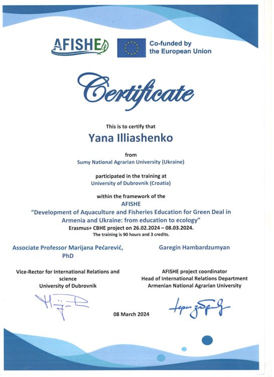 - Пройшла міжнародне стажування в університеті Дубровника (Хорватія) в рамках AFISHE “Development of Aquaculture and Fisheries Education for Green Deal in Armenia and Ukraine: from education to ecology” Erasmus+ CBHE project on 26.02.2024 – 08.03.2024