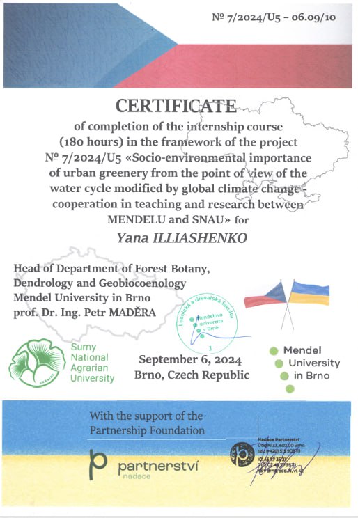 - Пройшла міжнародне стажування в університеті Менделя (м.Брно, Чехія) в рамках міжнародного проекту «Соціально-екологічна важливість міських зелених насаджень з точки зору кругообігу води, зміненого глобальними змінами клімату – співпраця в навчанні та дослідженнях між Університетом Менделя в Брно та Сумським національним аграрним університетом». 26.08.2024р.-06.09.2024р.