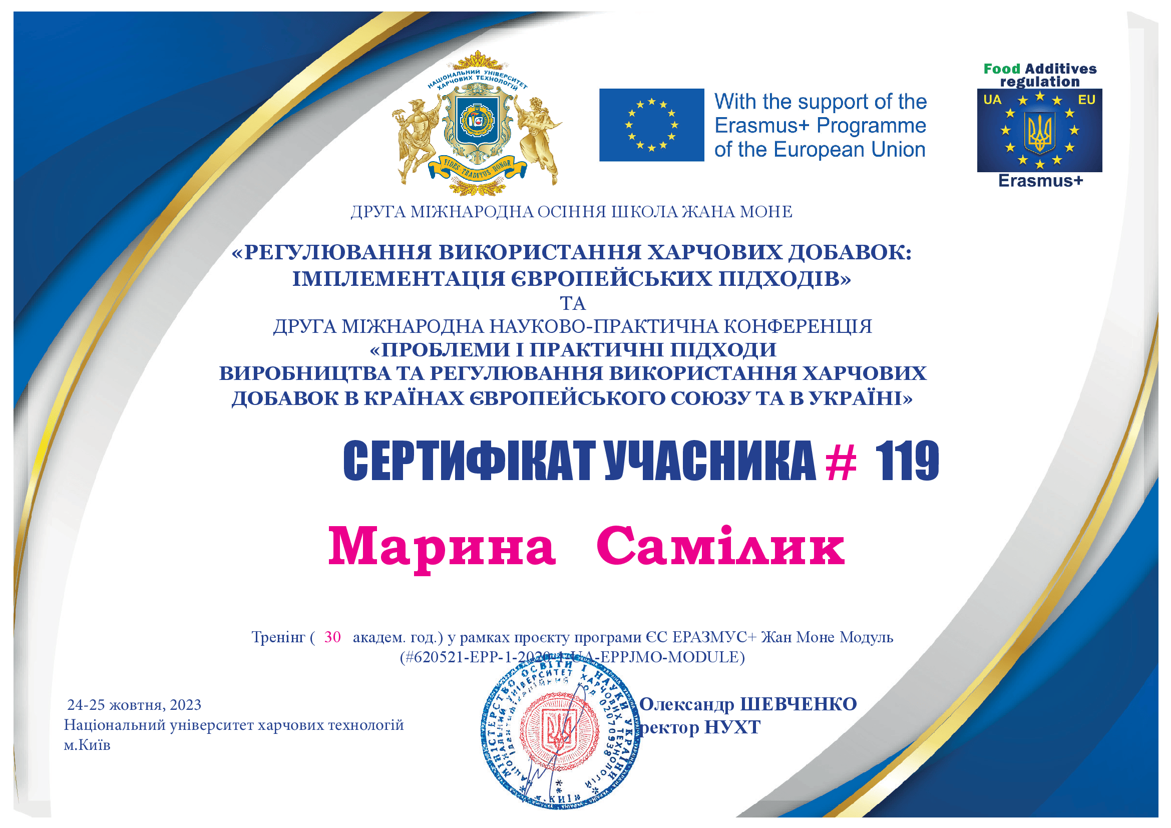 - Участь у Другій міжнародній осінній школі Жана Моне «Регулювання використання харчових добавок: імплементація європейських підходів» (30 академ. год.) у рамках проєкту програми ЄС ЕРАЗМУС+ Жан Моне Модуль (#620521-EPP-1-2020-1-UA-EPPJMO-MODULE) 24-25 жовтня, 2023р. Національний університет харчових технологій м.Київ
