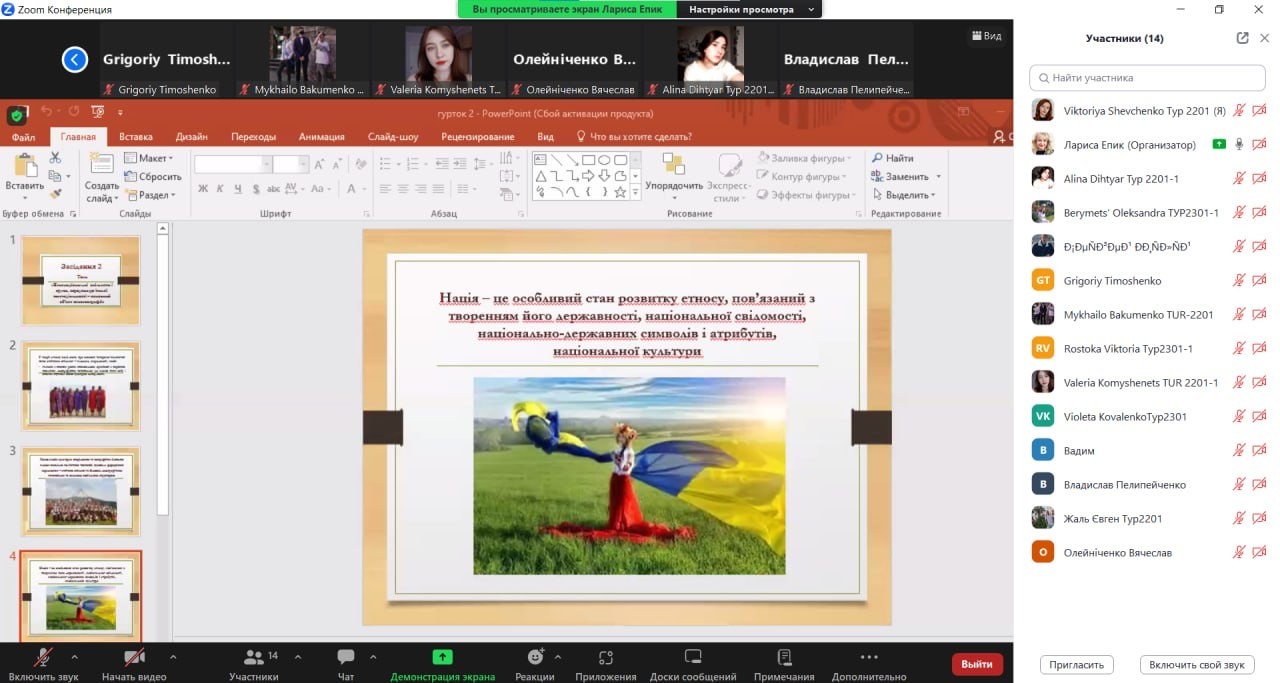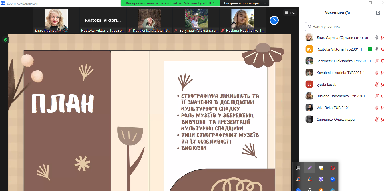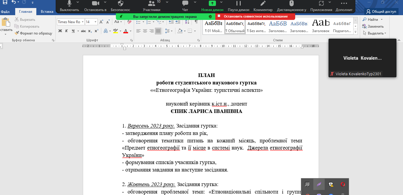 29 лютого 2024 року відбулося засідання наукового гуртка на якому заслухали і обговорили дві доповіді – «Етногеографія українських земель на початку ХХ ст. Етнодемогеографічні тенденції розвитку України впродовж ХХ – ХХІ ст», підготовлену Вікторією Шевченко і «Етнодемогеографічні співвідношення в структурі населення. України», підготовлену Володимиром Міщенко, студентами 2 курсу спеціальності 242 Туризм і рекреація. Змістовні доповіді супроводжувалися цікавими презентаціями і викликали жваве обговорення. По закінченню дискусії студенти отримали завдання на наступне засідання.