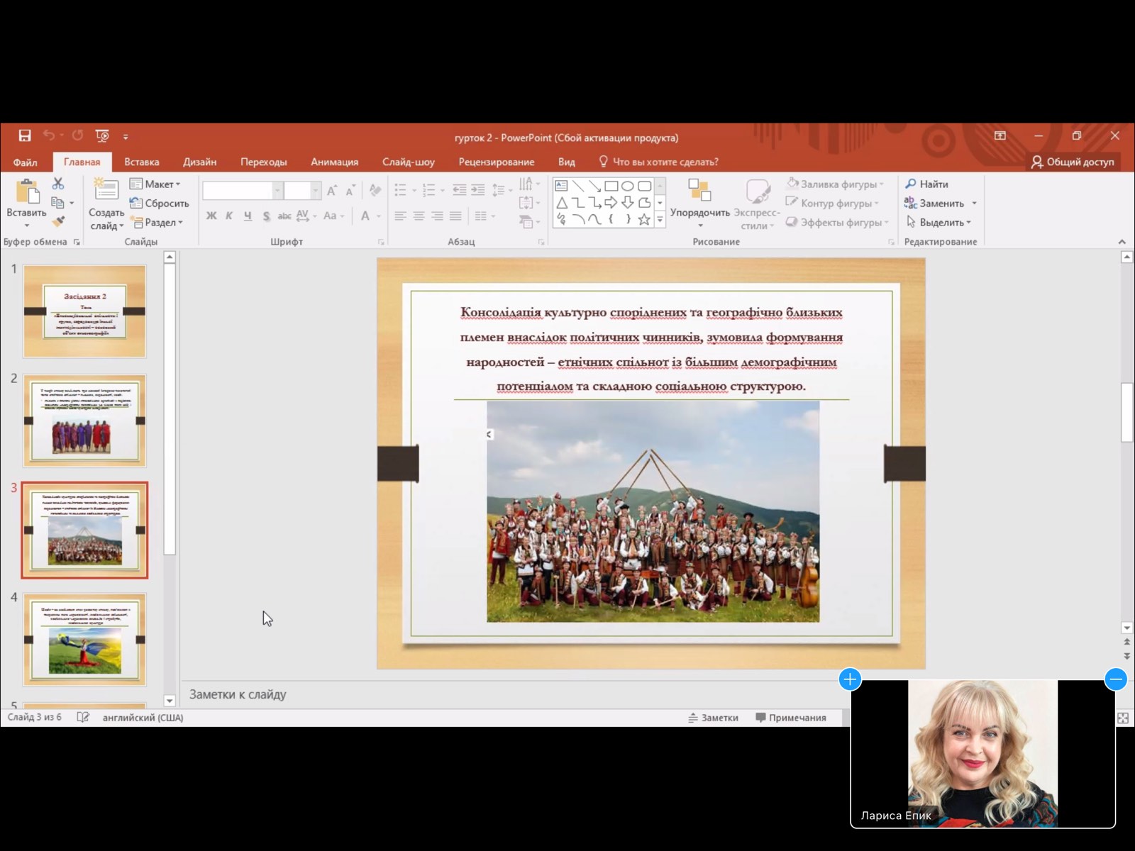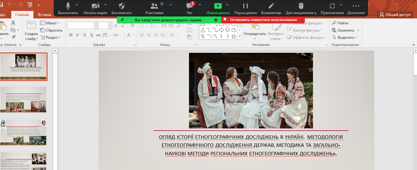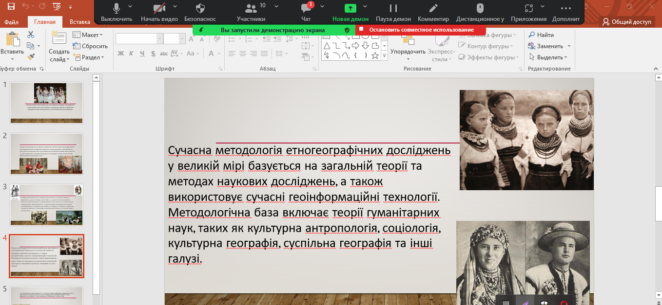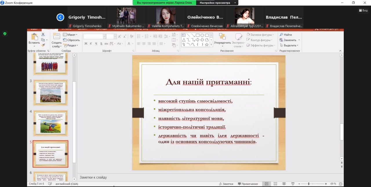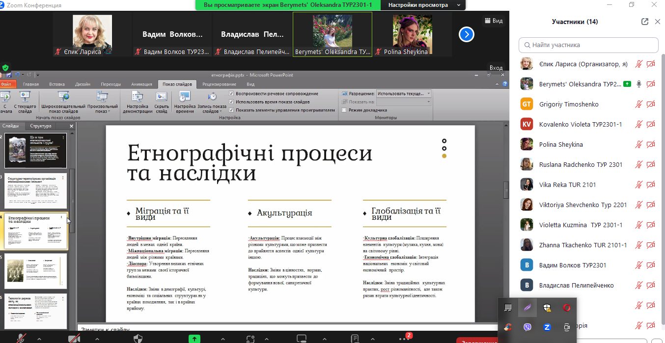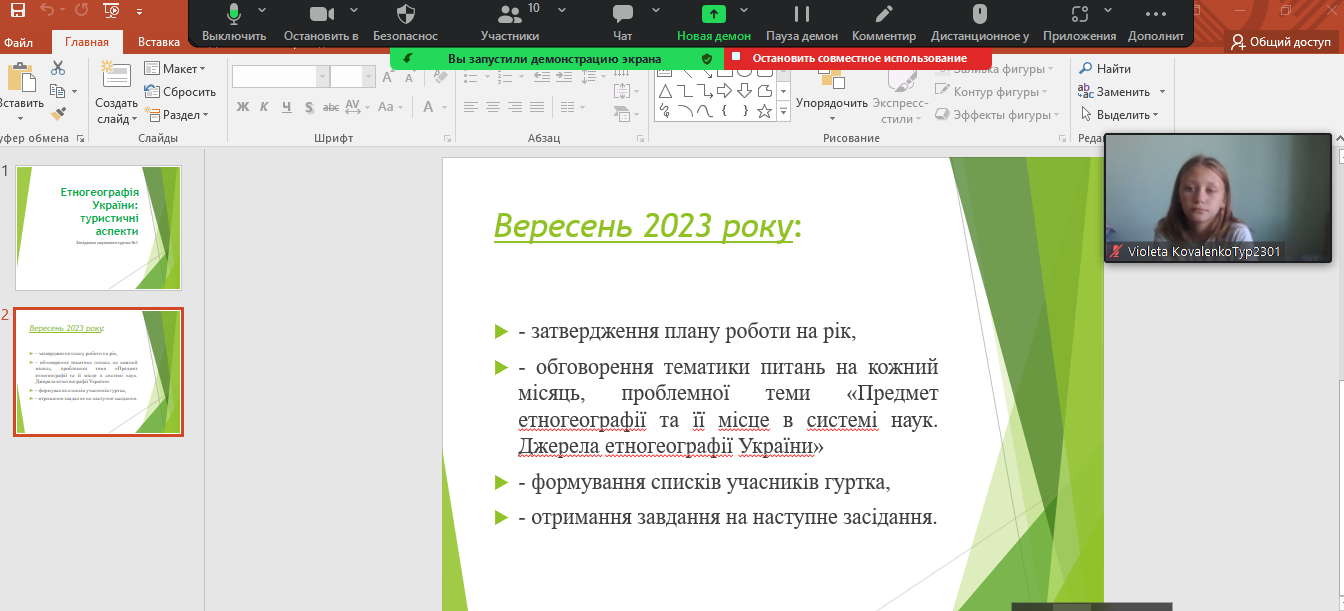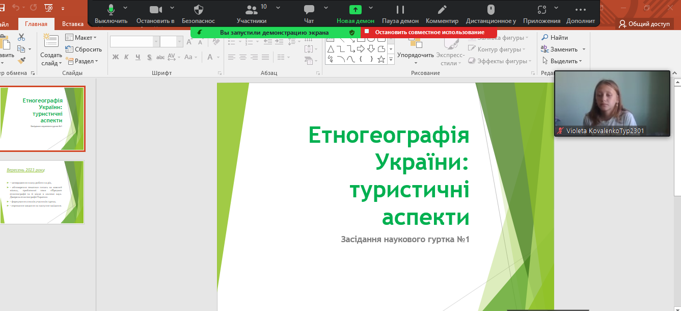 Темою для обговорення стала «Структурно-територіальна організація етнонаціональних спільнот і груп. Етногеографічні процеси. Типологія держав світу за етнонаціональним складом населення», яку підготувала студентка 1 курсу Олександра Берімець. Доповідь і презентація викликали інтерес і питання до доповідачки і як наслідок – невелику дискусію. Засідання завершилося отриманням завдання до наступної зустрічі.