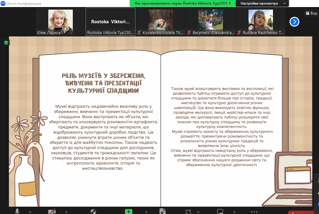 26 жовтня 2023 року відбулося друге засідання наукового студентського гуртка «Етногеографія України: туристичні аспекти». Учасники гуртка, студенти і магістранти спеціальності 242 Туризм і рекреація, прослухали і обговорили доповідь керівника гуртка, доцента Єпик Л.І., на тему «Етнонаціональні спільноти і групи, середовище їхньої життєдіяльності – основний об’єкт етногеографії», отримали завдання на наступне засідання.