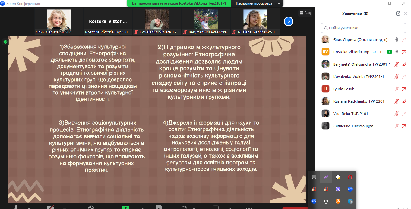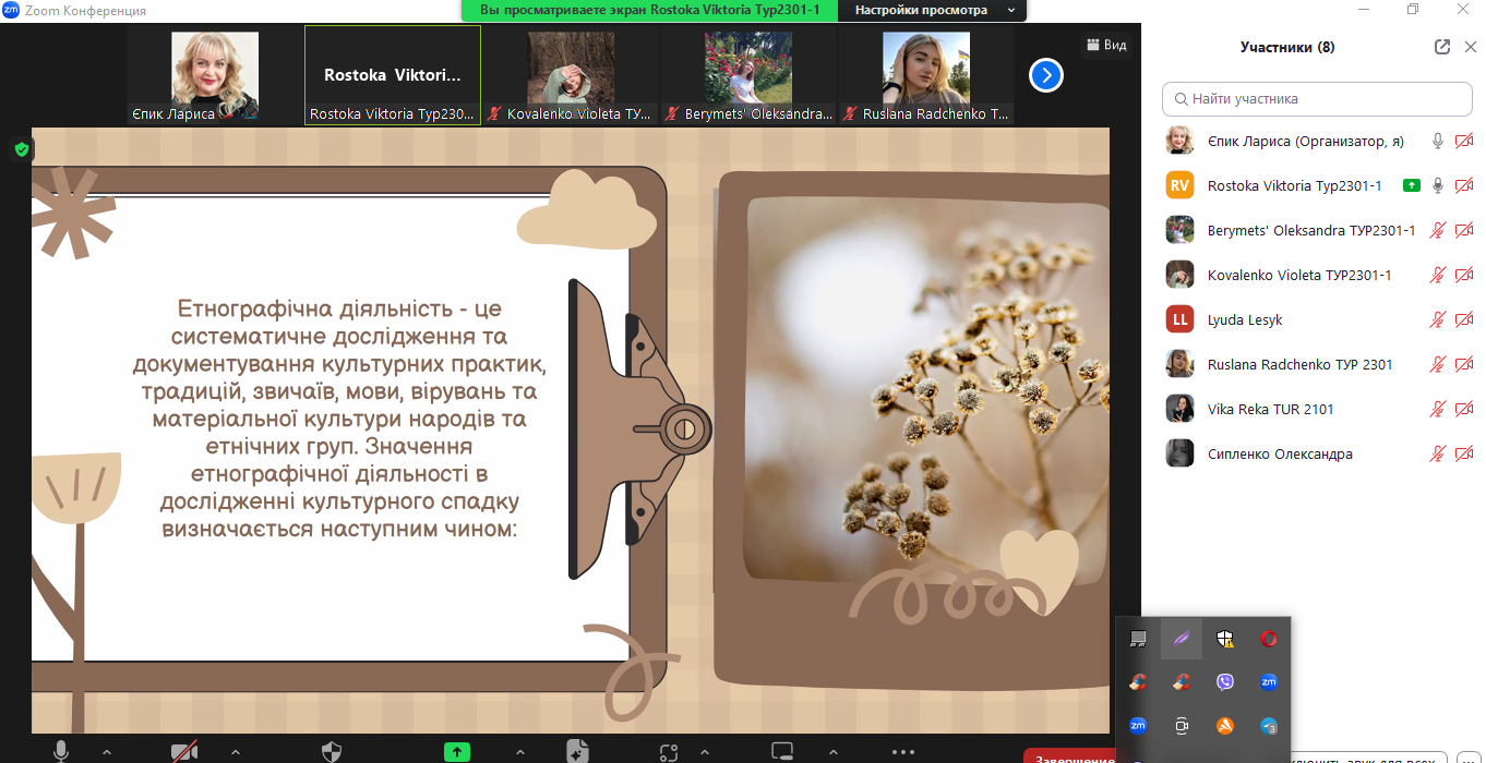 25 грудня 2023 року відбулося чергове засідання наукового гуртка «Етногеографія України: туристичні аспекти» у якому взяли участь студенти і магістранти спеціальності 242 туризм і рекреація разом із доцентом кафедри туризму Єпик Л.І.
