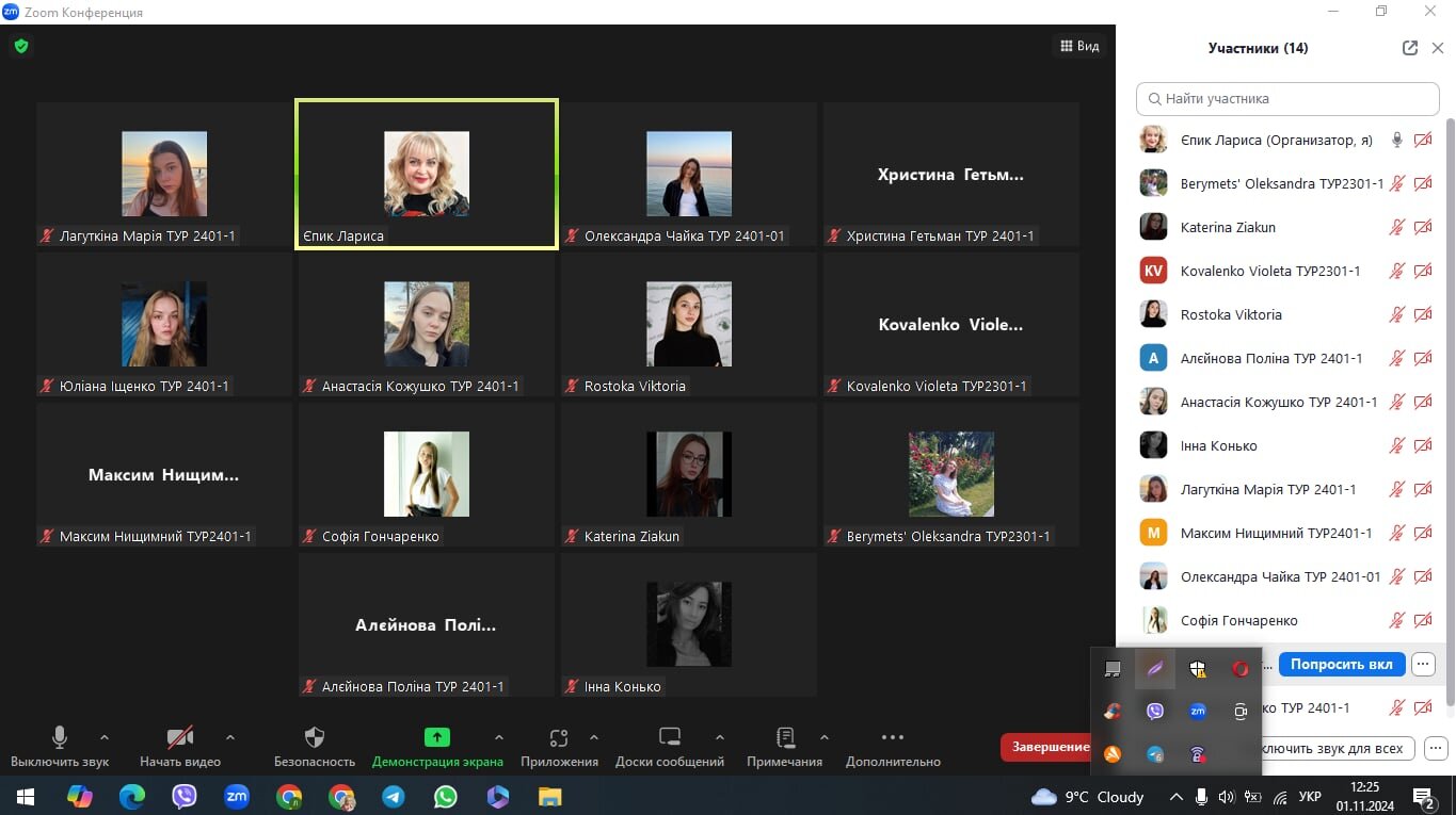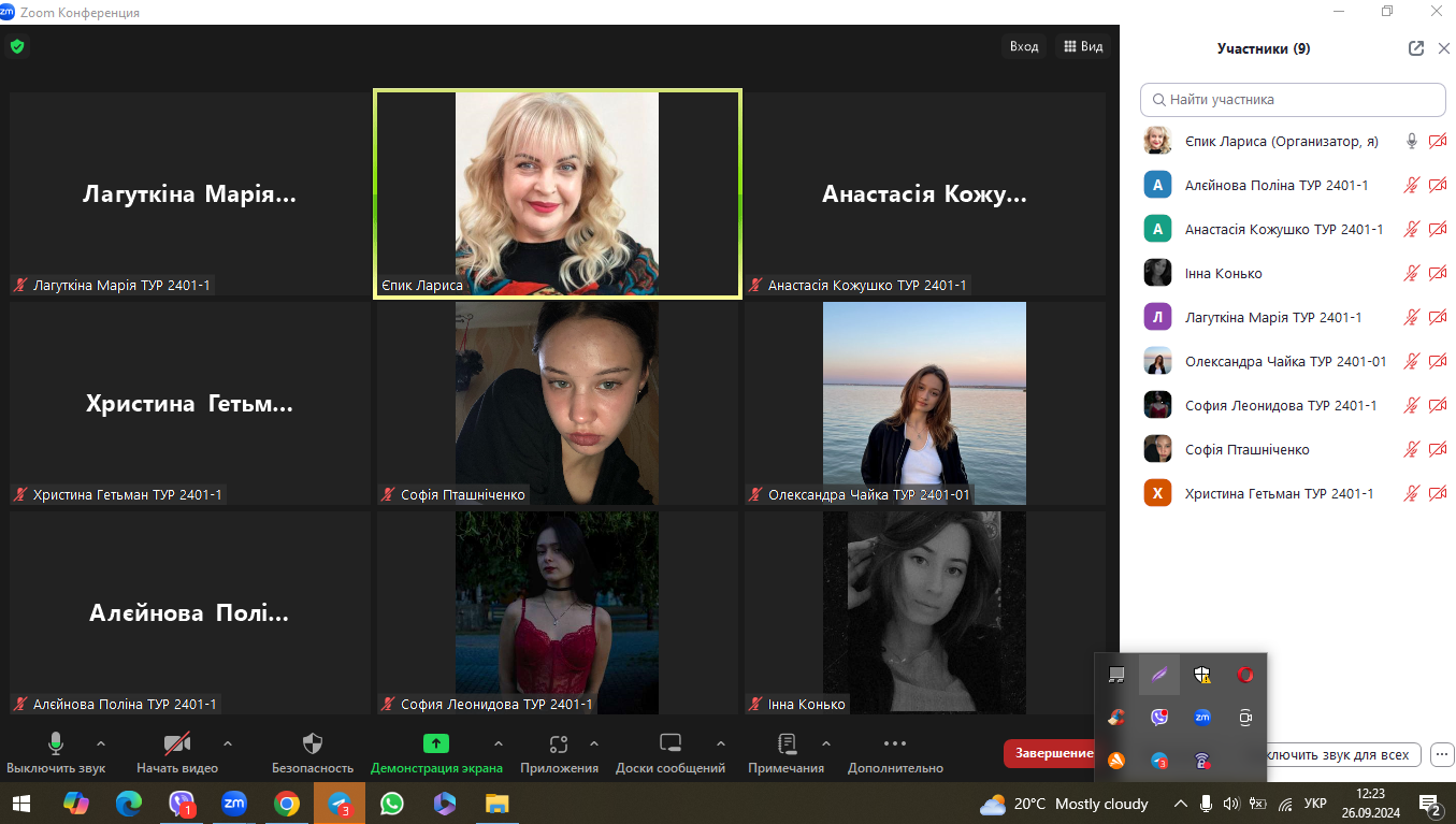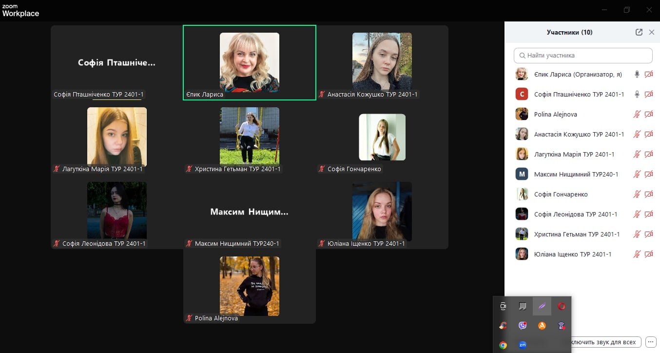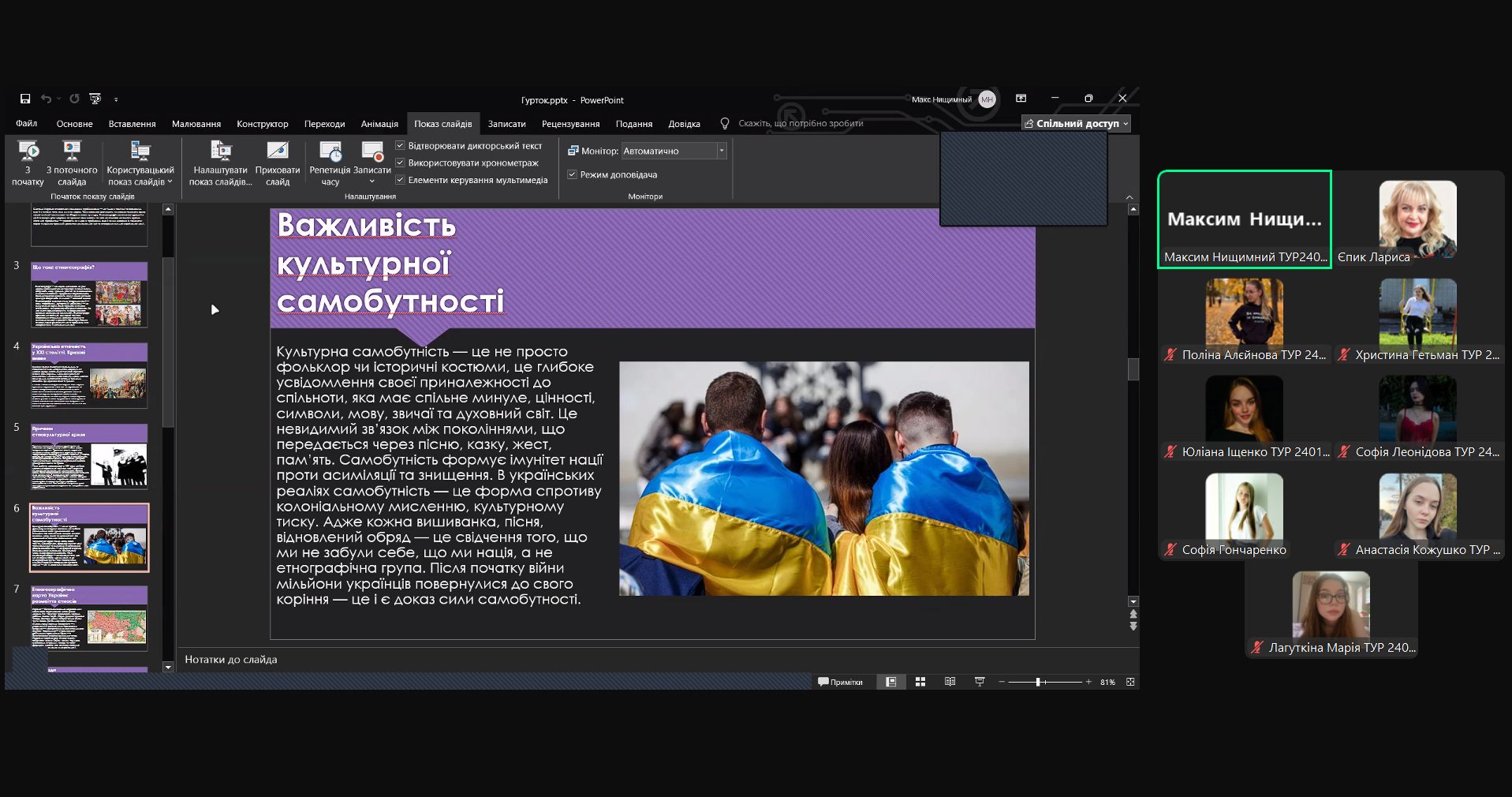 Студенти спеціальності 242 Туризм і рекреація заслухали доповідь Софії Пташніченко, студентки 1 курсу, на тему «Етнодемогеографічні співвідношення в структурі населення. України. Ідентифікація суб’єктів етногеографічних взаємин. Географія української етнічної нації в Україні. Геополітичні проблеми етнокультурної єдності і консолідації». Доповідь супроводжувалася інформативною презентацією, викликала зацікавлення у присутніх і завершилася активним обговоренням.