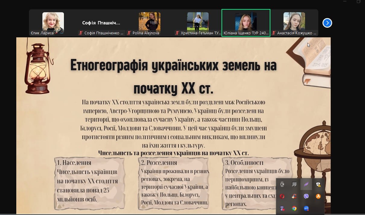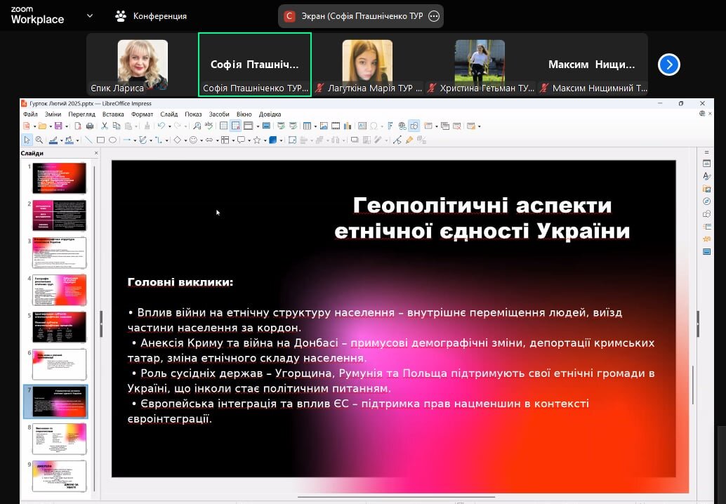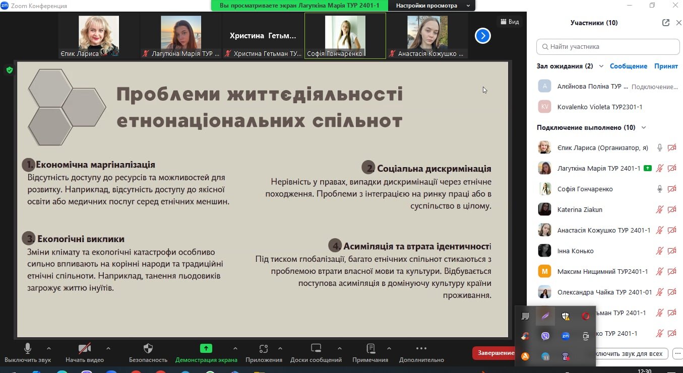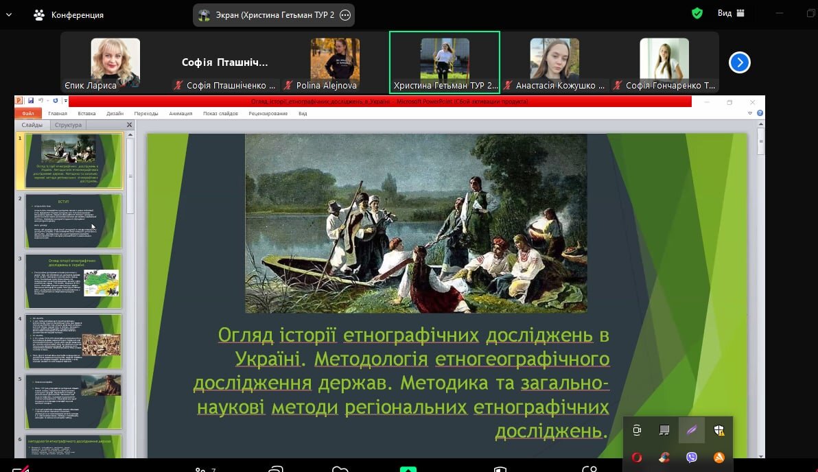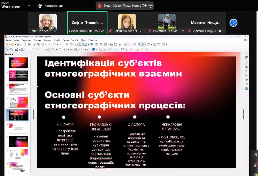 На обговорення було винесено тему «Структурно-територіальна організація етнонаціональних спільнот і груп. Етногеографічні процеси. Типологія держав світу за етнонаціональним складом населення». Із доповіддю виступили студентки 1 курсу спеціальності 242 Туризм і рекреація Анастасія Кожушко і Софія Пташніченко. Доповідь студентки супроводжували яскравою і змістовною презентацією.