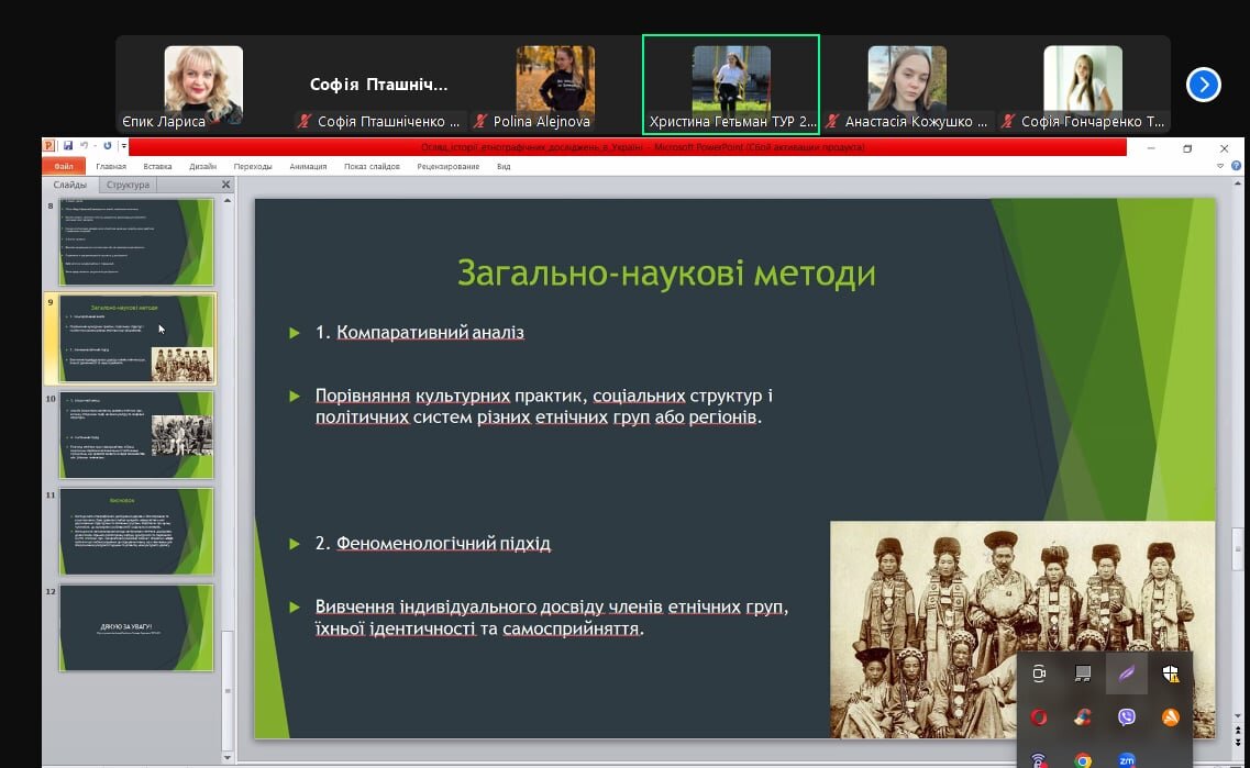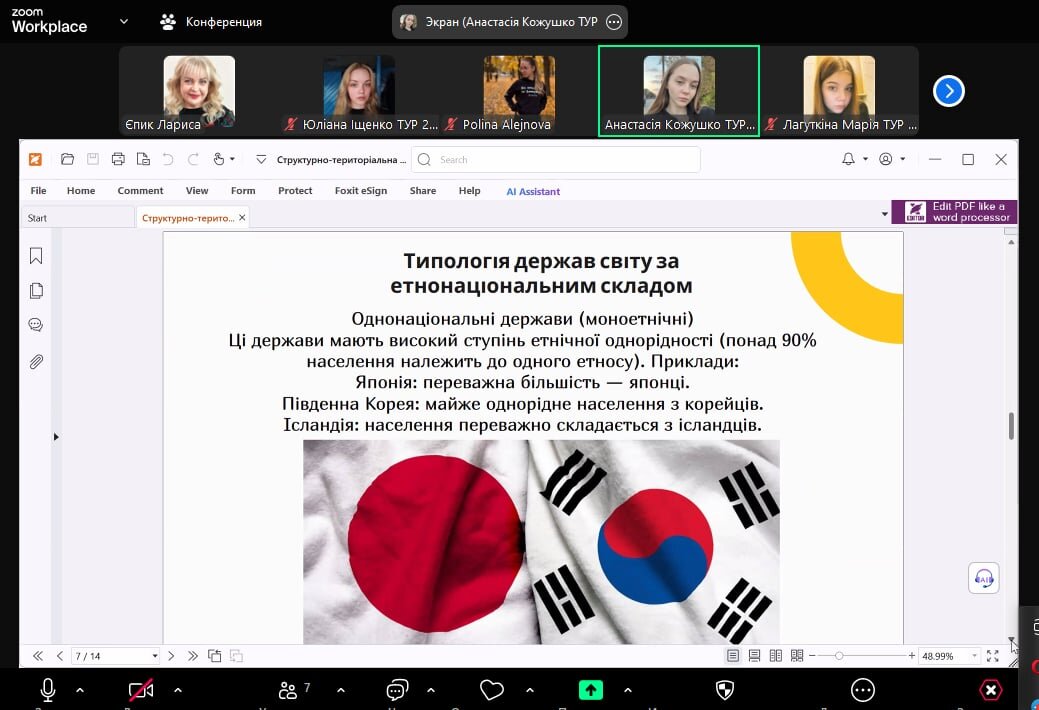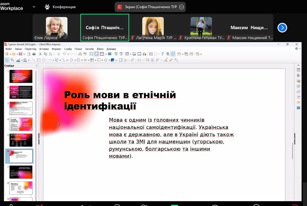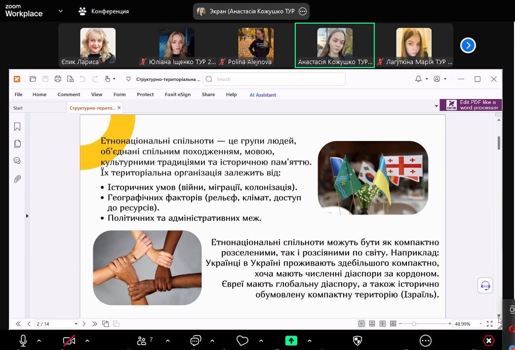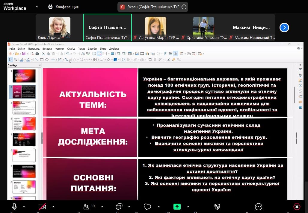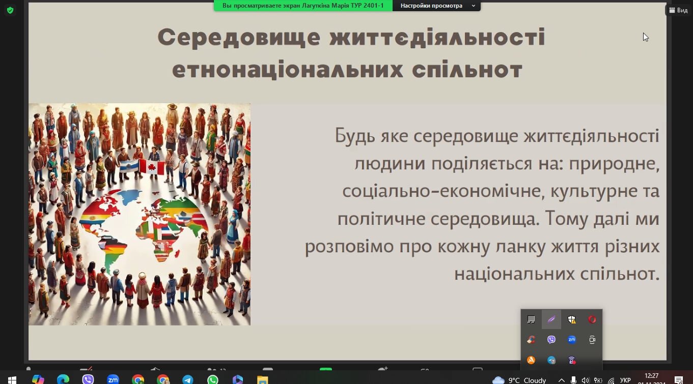 На обговорення було винесено тему «Структурно-територіальна організація етнонаціональних спільнот і груп. Етногеографічні процеси. Типологія держав світу за етнонаціональним складом населення». Із доповіддю виступили студентки 1 курсу спеціальності 242 Туризм і рекреація Анастасія Кожушко і Софія Пташніченко. Доповідь студентки супроводжували яскравою і змістовною презентацією.