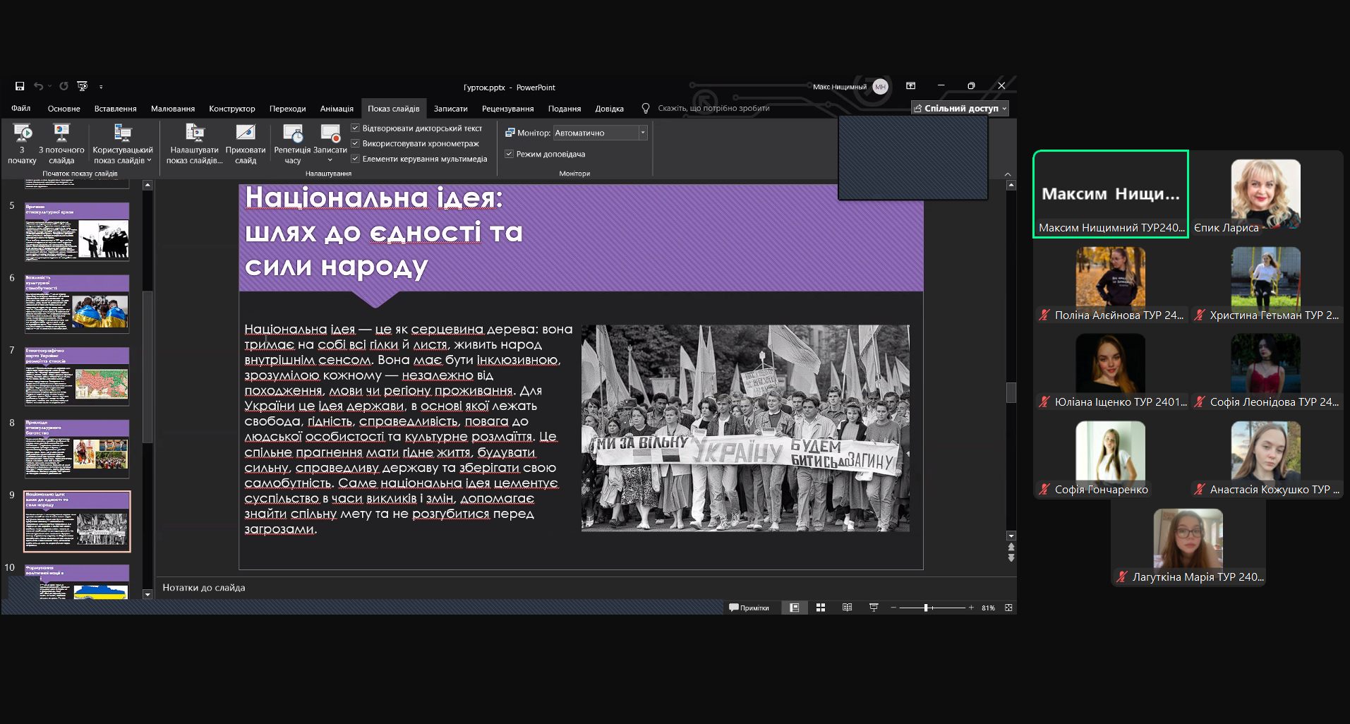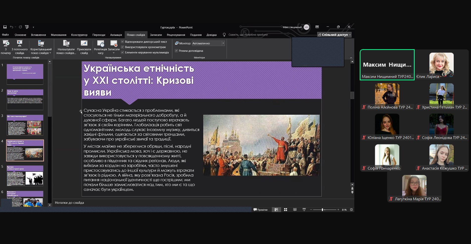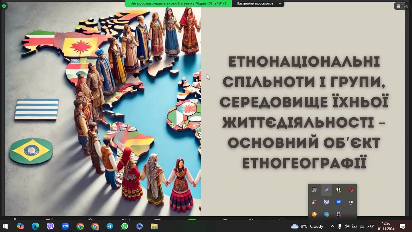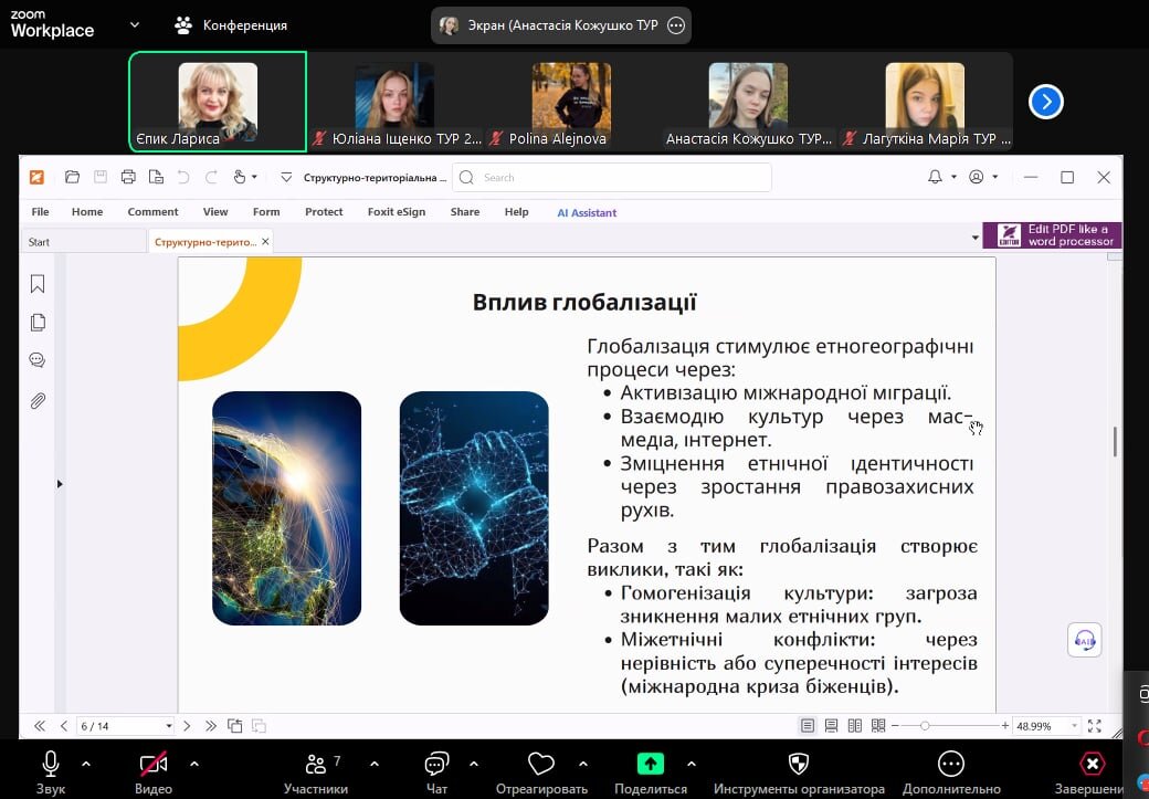 На обговорення було винесено тему «Структурно-територіальна організація етнонаціональних спільнот і груп. Етногеографічні процеси. Типологія держав світу за етнонаціональним складом населення». Із доповіддю виступили студентки 1 курсу спеціальності 242 Туризм і рекреація Анастасія Кожушко і Софія Пташніченко. Доповідь студентки супроводжували яскравою і змістовною презентацією.