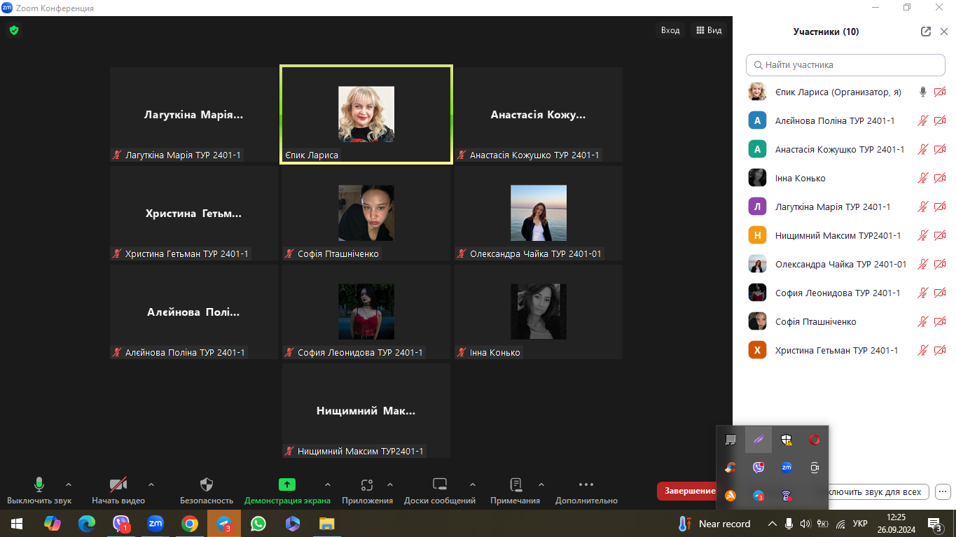 26 вересня відбулося засідання наукового студентського гуртка “Етногеографія України: туристичний аспект”. Було узгоджено план роботи на на 2024-2025 навчальний рік, обговорено тематику питань на кожний місяць. З доповіддю на тему «Предмет етногеографії та її місце в системі наук. Джерела етногеографії України» виступила керівник гуртка, доцент Єпик Л.І. Після обговорення доповіді присутні отримали завдання на наступну зустріч.