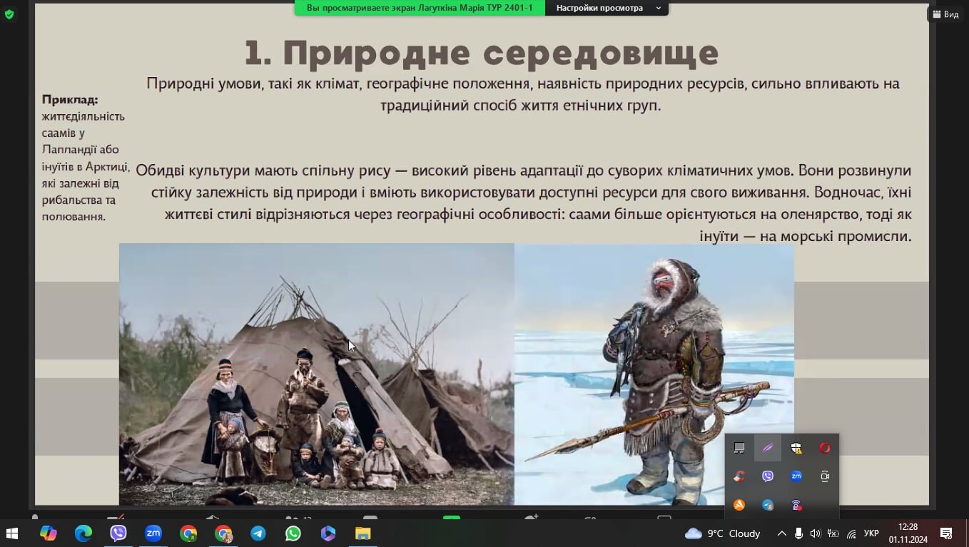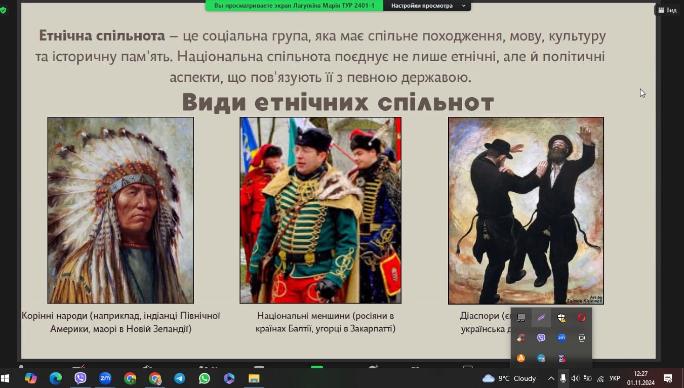 Наприкінці жовтня 2024 року відбулося друге засідання наукового гуртка студентів та магістрантів спеціальності 242 Туризм і рекреація «Етногеографія України: туристичні аспекти» на якому обговорювалося питання «Етнонаціональні спільноти і групи, середовище їхньої життєдіяльності – основний об’єкт етногеографії». Із доповіддю, яка супроводжувалася презентацією, виступили студентки 1 курсу групи ТУР 2401-1 Гончаренко Софія та Лагуткіна Марія.