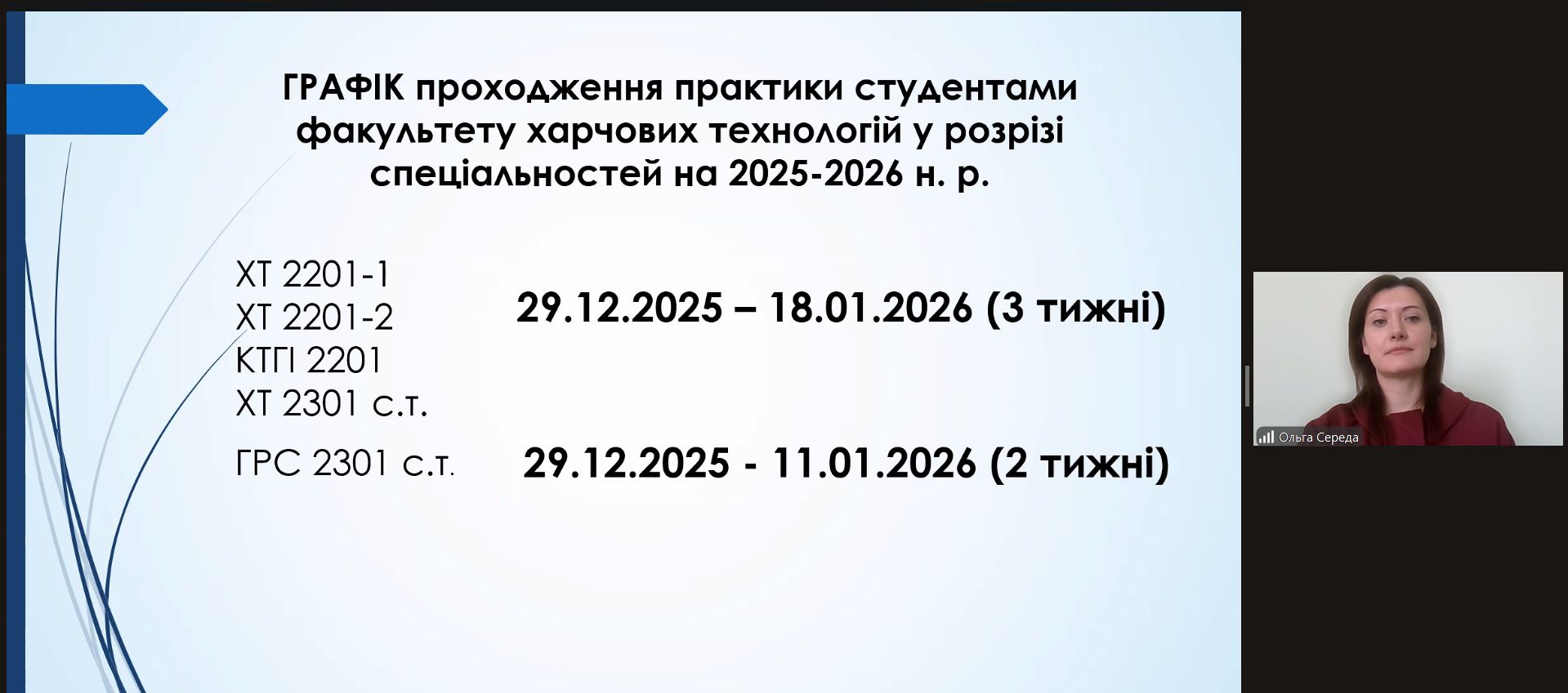 На факультеті харчових технологій відбулася онлайн-зустріч зі здобувачами освітніх програм «Харчові технології», «Крафтові технології та гастрономічні інновації» та «Готельно-ресторанна справа», присвячена питанням оформлення документів до переддипломної практики.