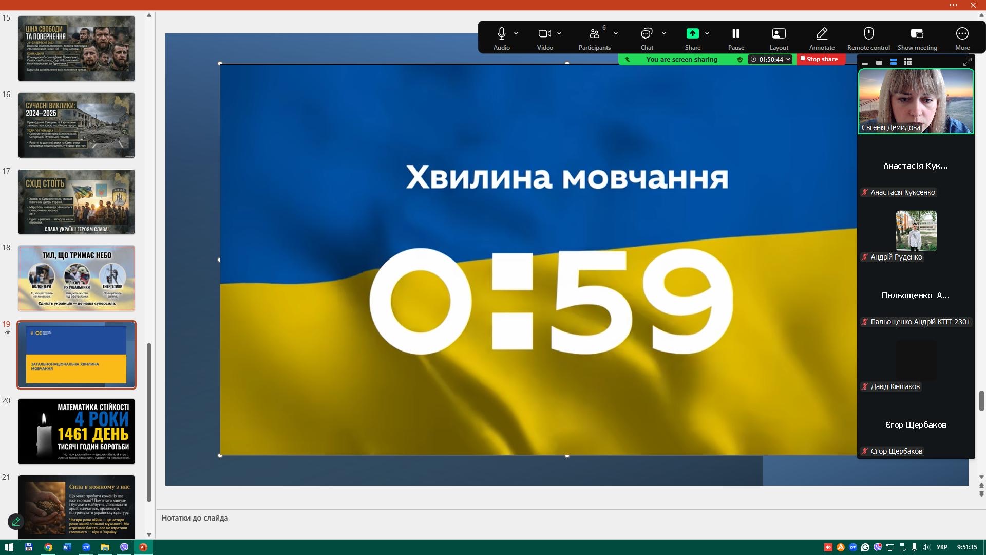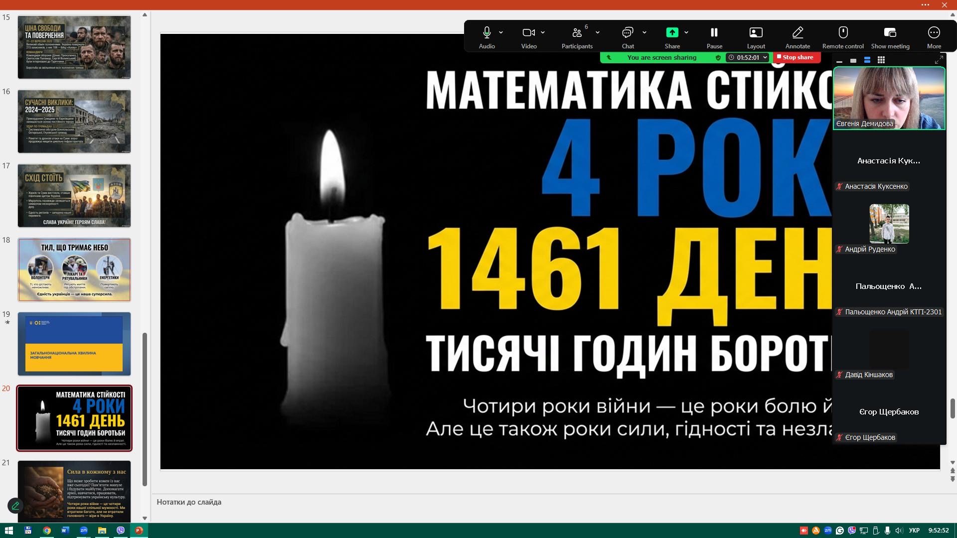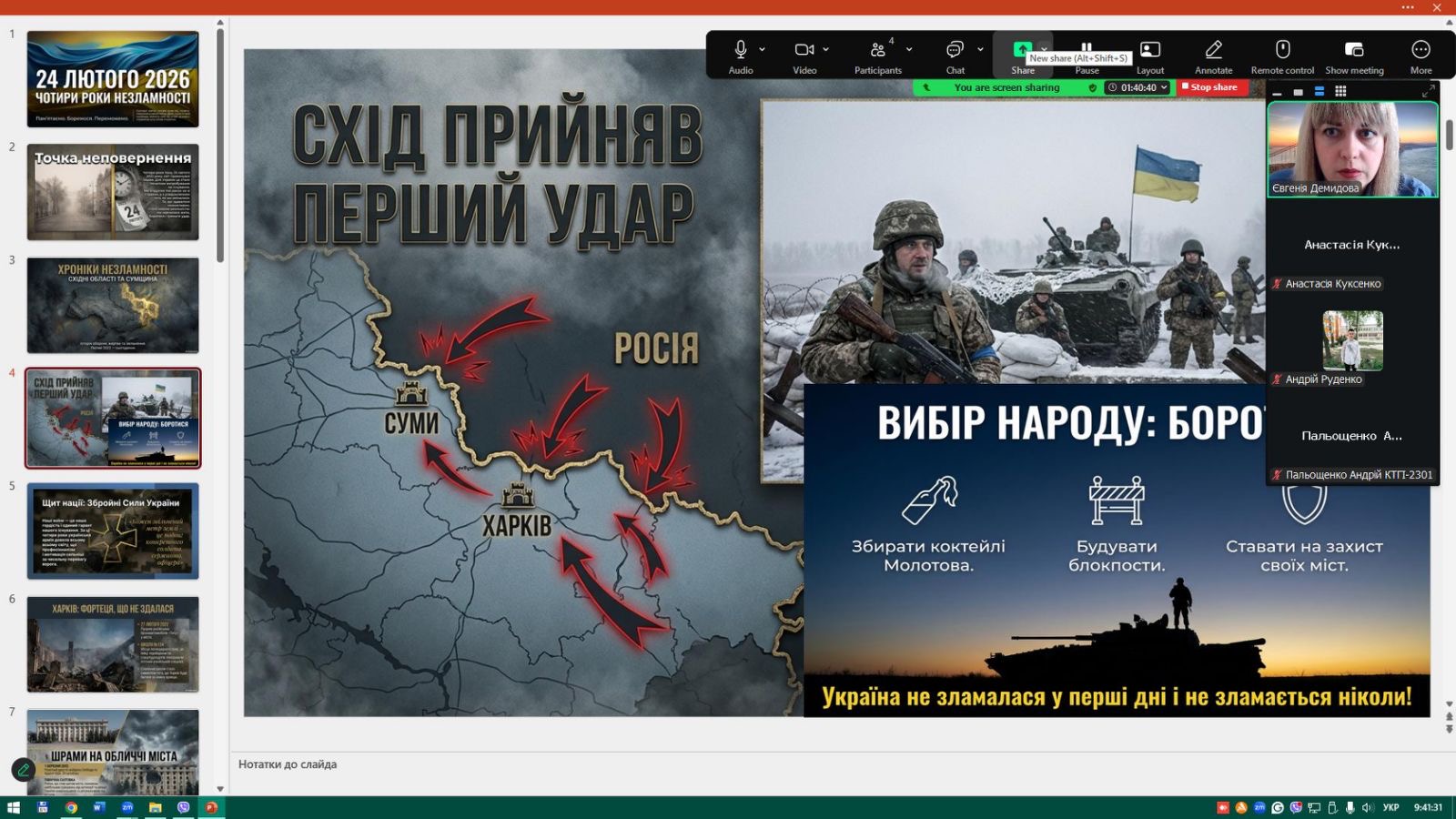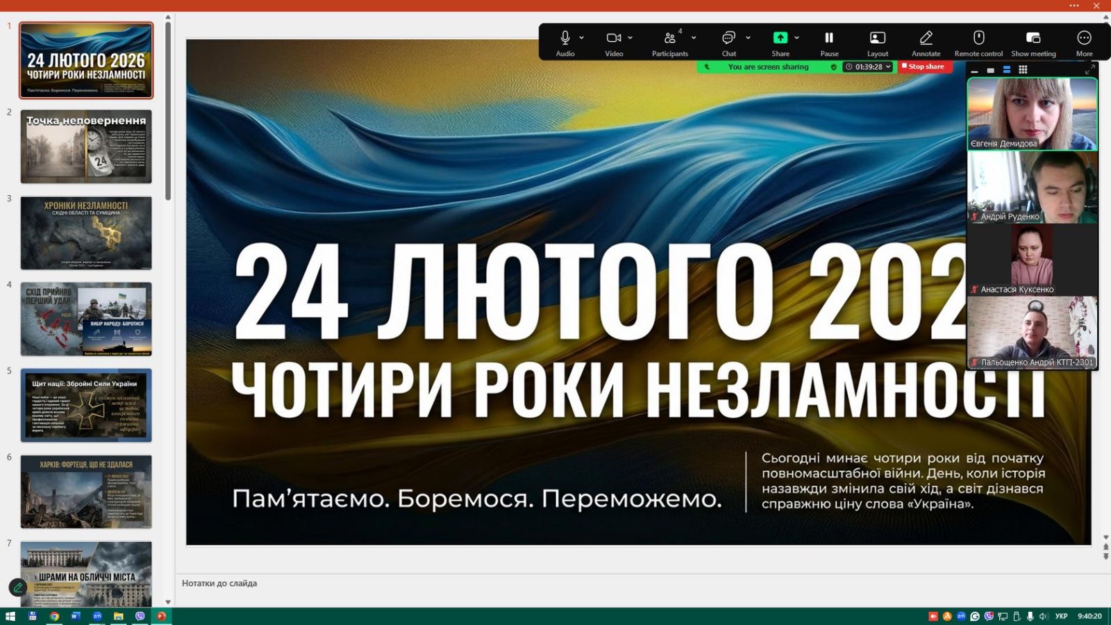 З нагоди четвертої річниці повномасштабного вторгнення на факультеті харчових технологій куратори академічних груп провели зустрічі зі здобувачами освіти. Під час цих зустрічей обговорювали події, що змінили наше життя, говорили про значення пам’яті, про особисту відповідальність кожного за збереження правди, про підтримку одне одного в умовах тривалого стресу. Студенти ділилися власними історіями, думками та переживаннями, вшановували хвилиною мовчання загиблих, висловлювали слова вдячності захисникам і захисницям України.