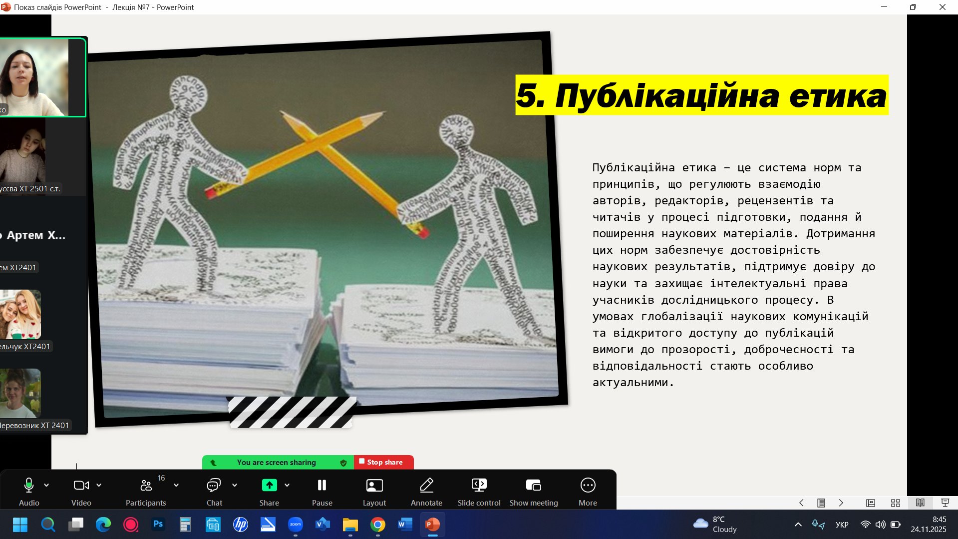 Під час зустрічі було розглянуто ключові аспекти етики та академічної доброчесності, зокрема важливість відповідального ставлення до навчання, коректного використання джерел, уникнення плагіату та дотримання принципів чесності у науковій діяльності.