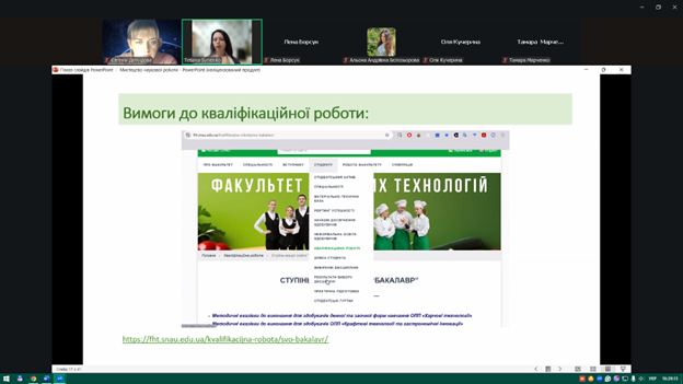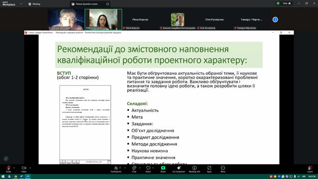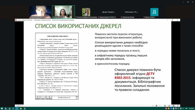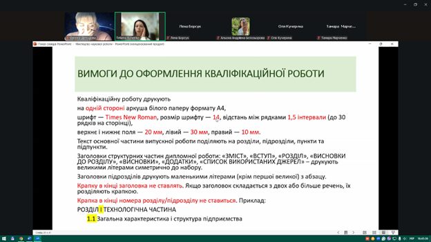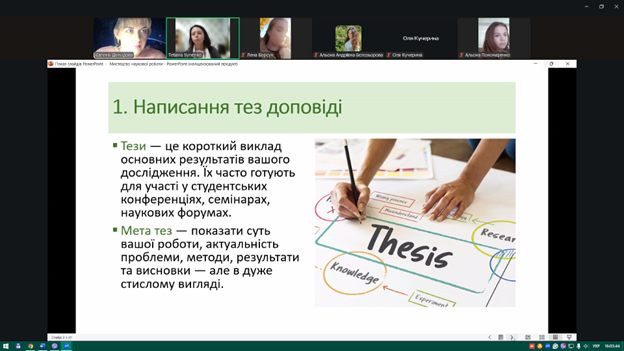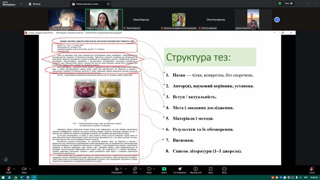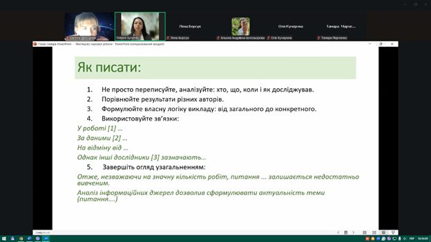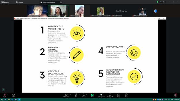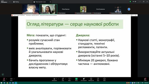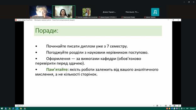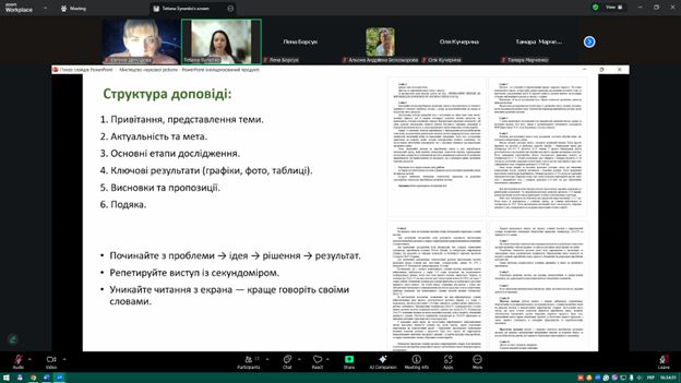 Під час заходу здобувачі ознайомилися з основними вимогами до оформлення наукових матеріалів, структурою кваліфікаційних робіт, особливостями підготовки доповідей та наукових тез. Також було розглянуто приклади ефективних презентацій та поширені помилки, яких варто уникати під час підготовки виступів.