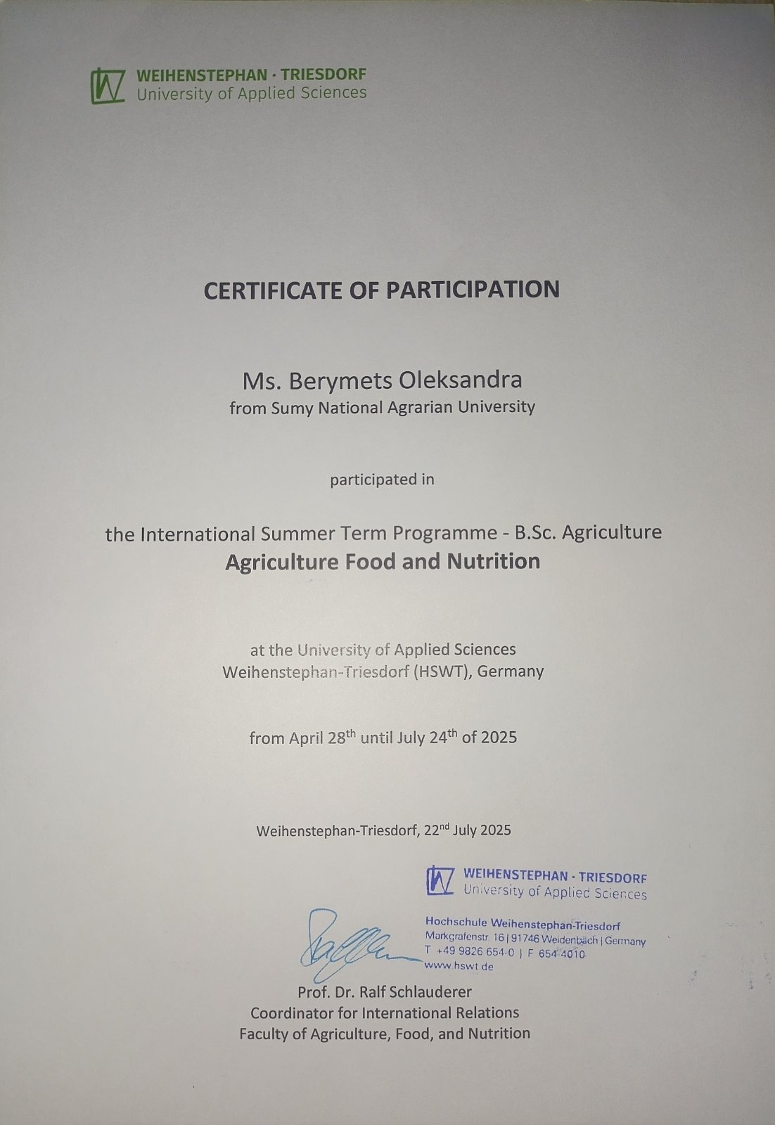 Згідно з наказом від 19.03.2025 №518/ОС серед учасників програми були студентки 3 курсу спеціальності 242 «Туризм» Сумського національного аграрного університету Вікторія Ростока та Олександра Беримець, які успішно навчалися у межах цього міжнародного освітнього проєкту.