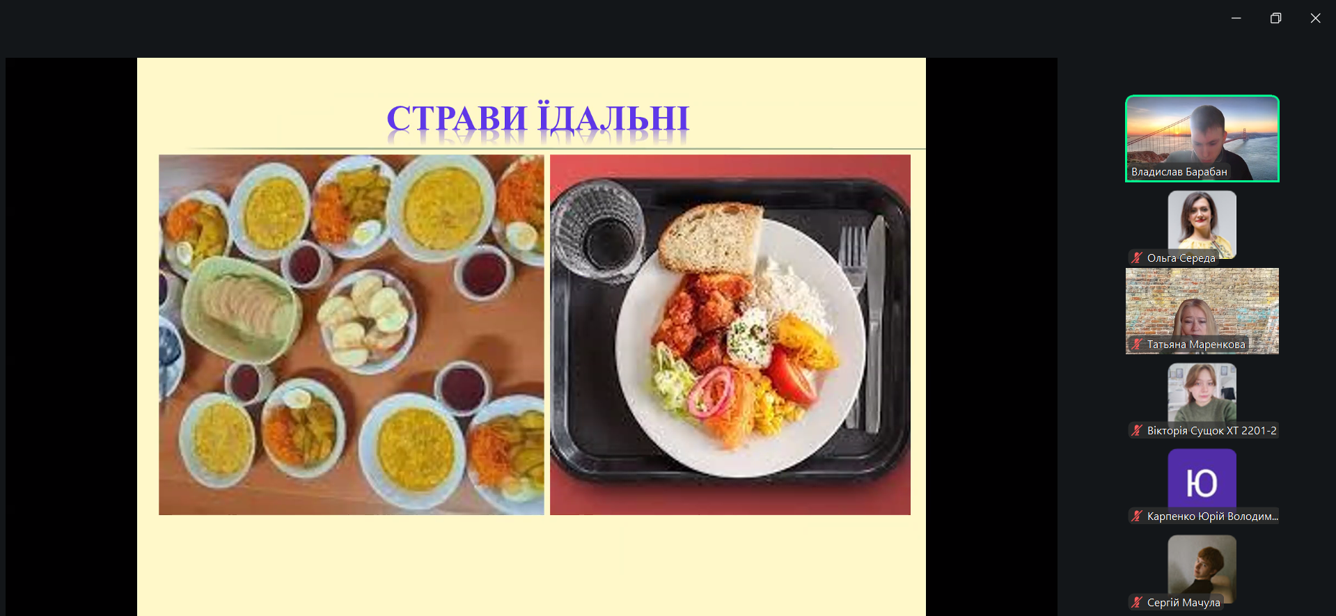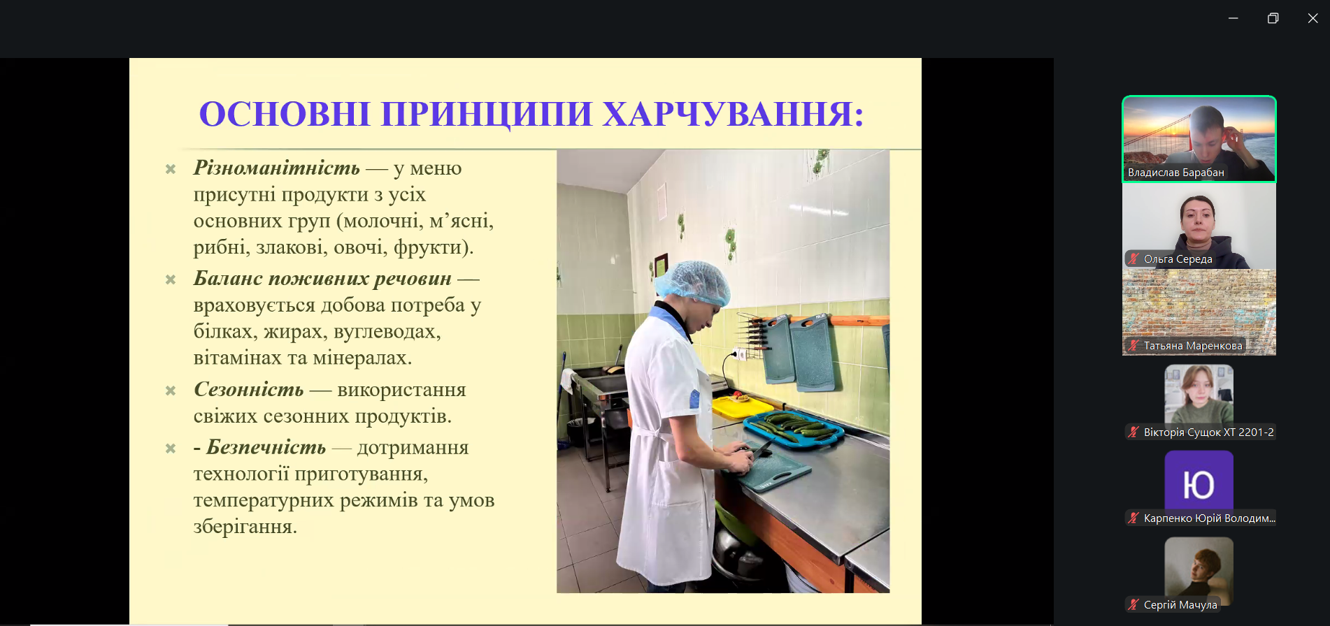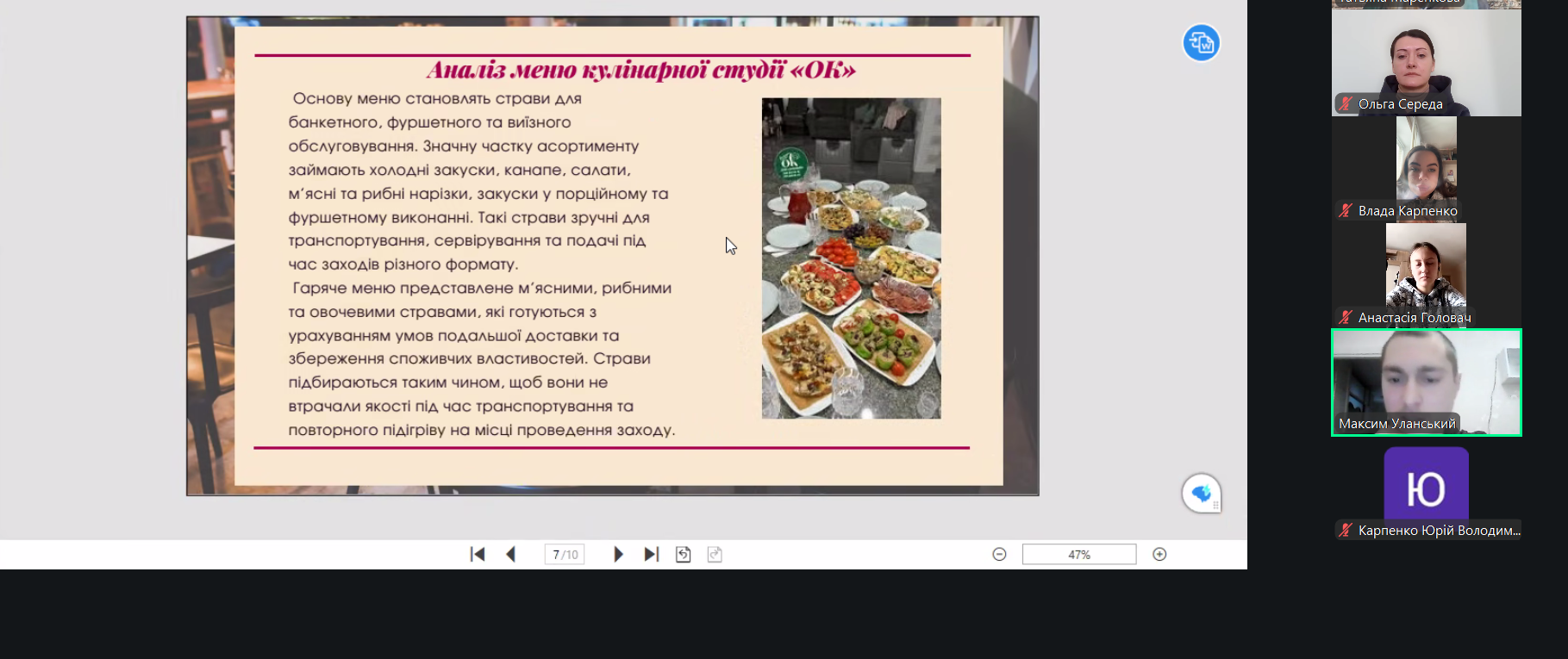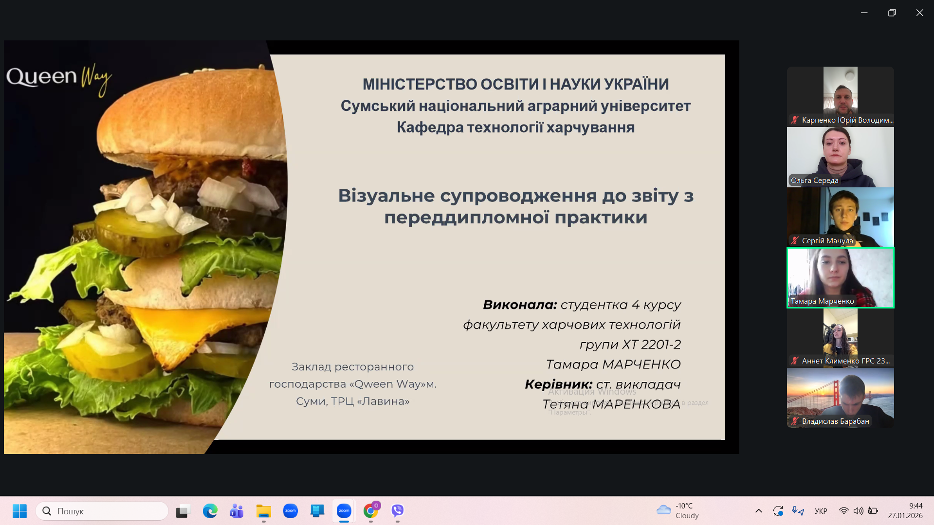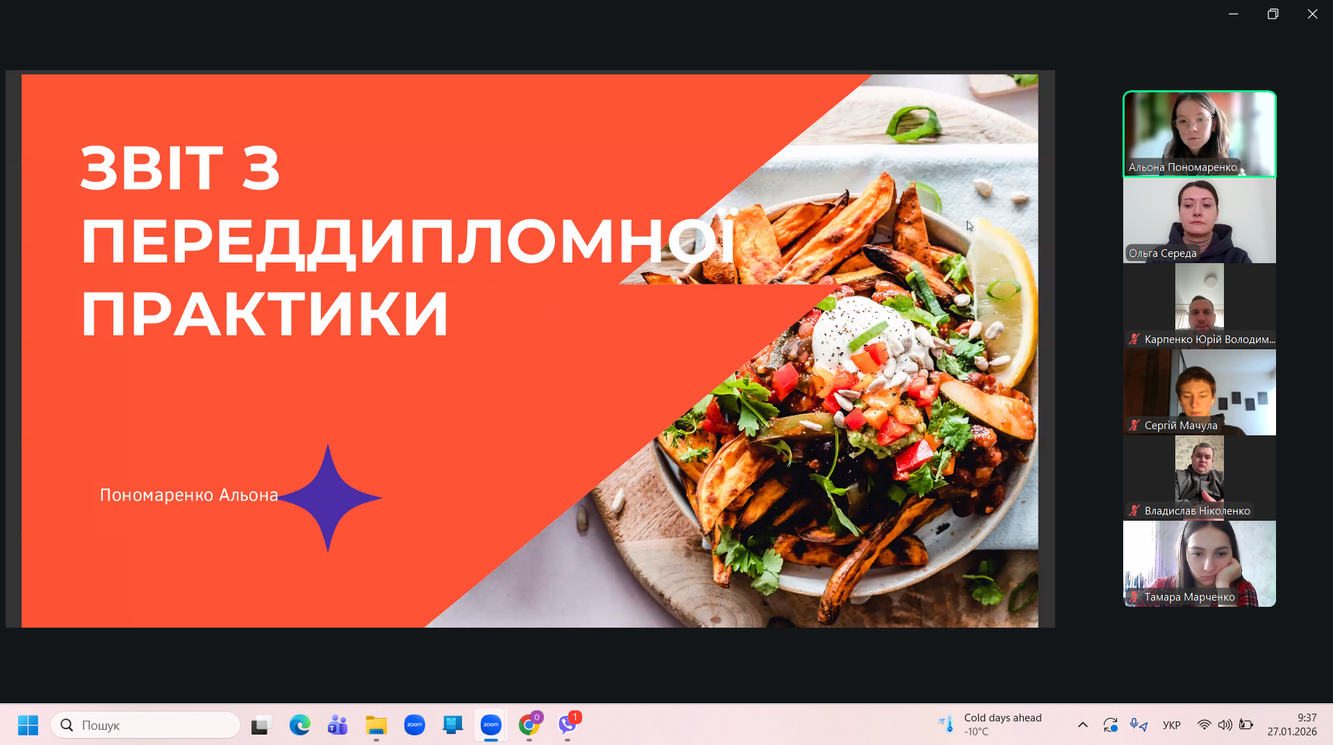 27 січня 2026 року на факультеті харчових технологій в онлайн-форматі відбувся захист звітів з переддипломної практики здобувачів вищої освіти 3 с.т. та 4 курсу освітнього ступеня «Бакалавр», які навчаються за освітньо-професійними програмами «Харчові технології», «Крафтові технології та гастрономічні інновації» та «Готельно-ресторанна справа».