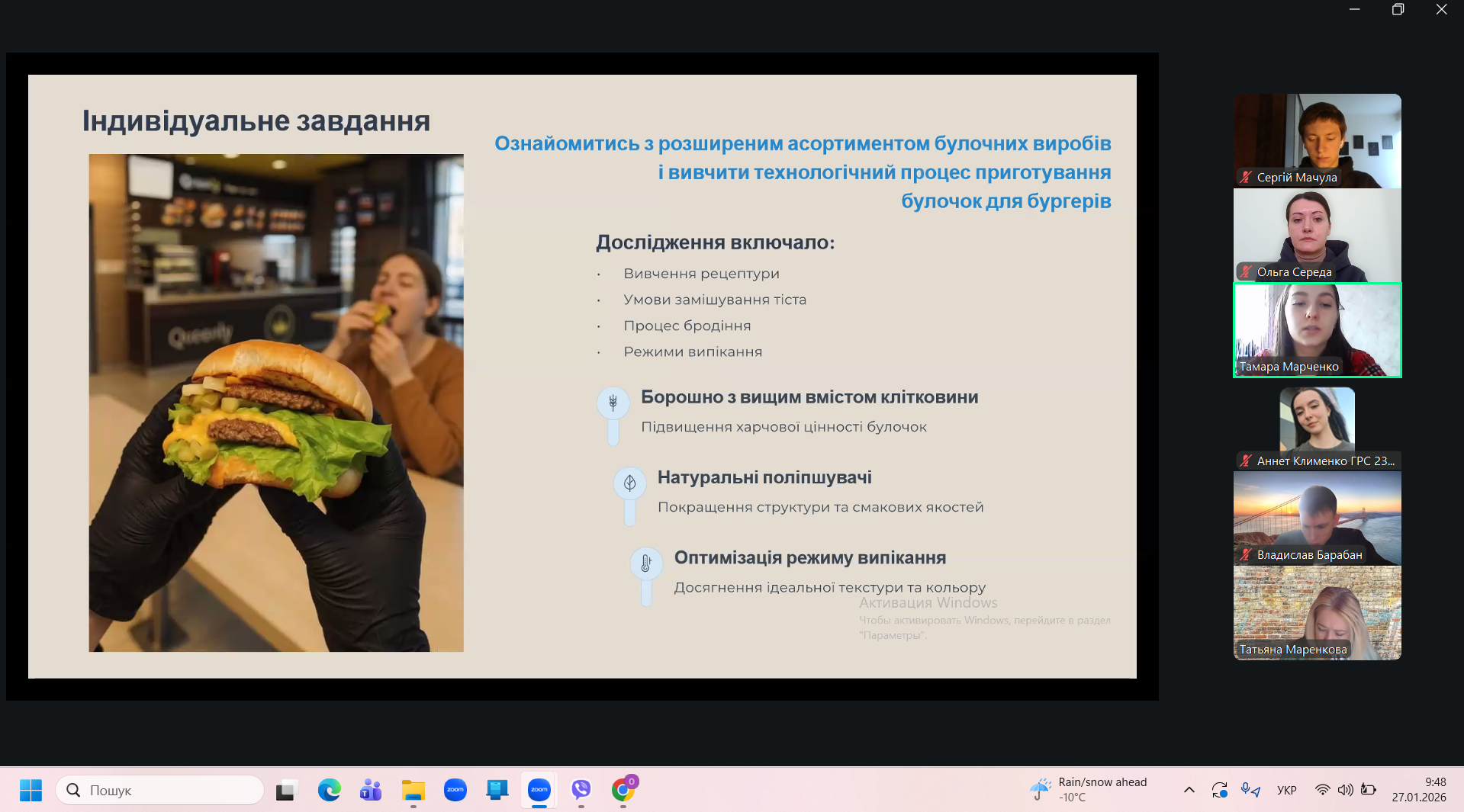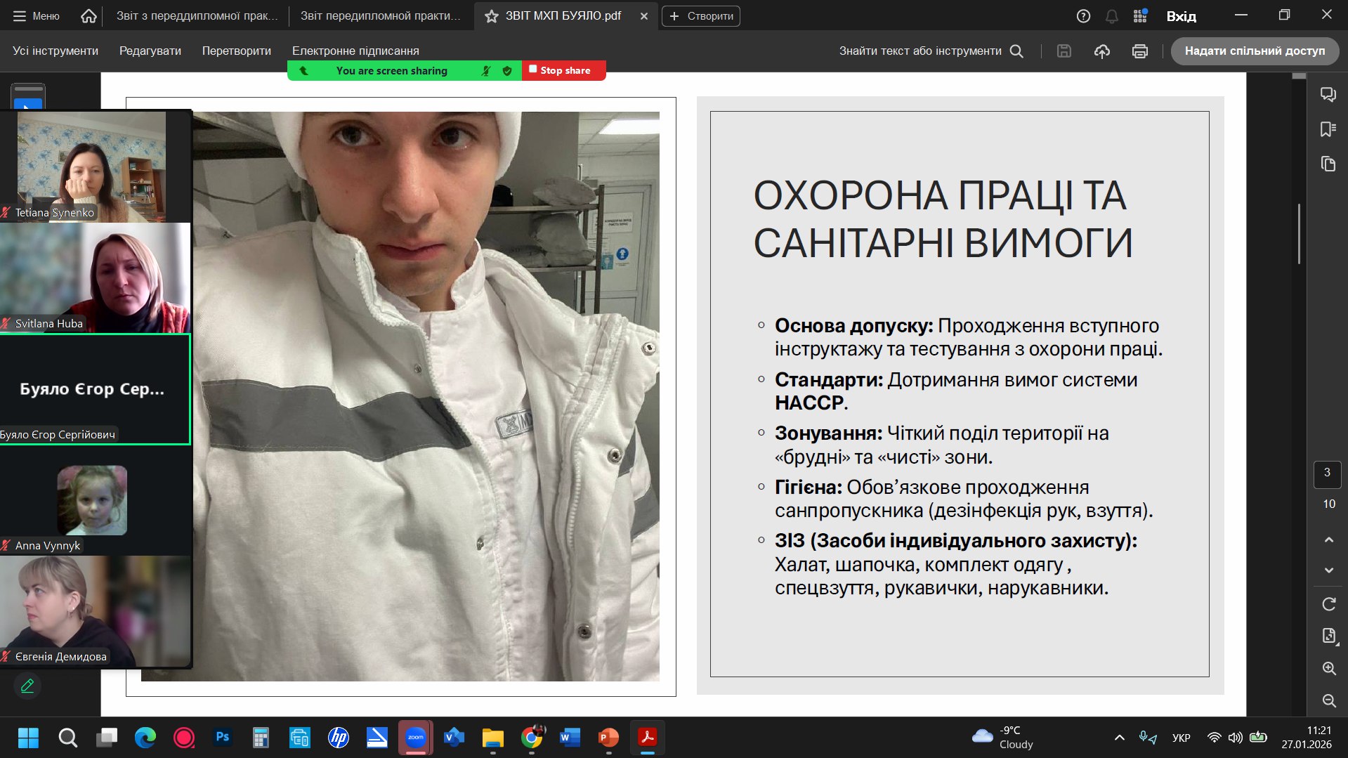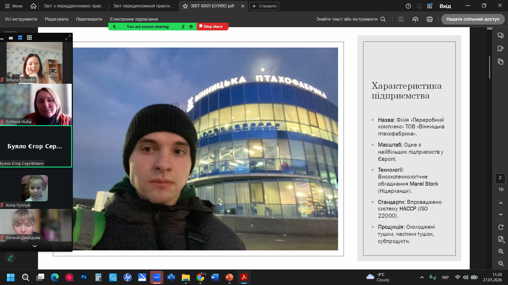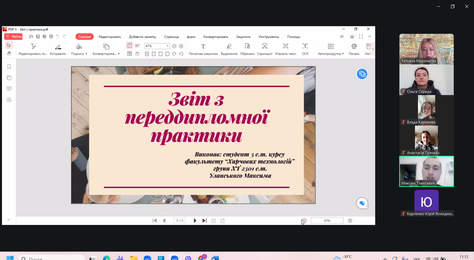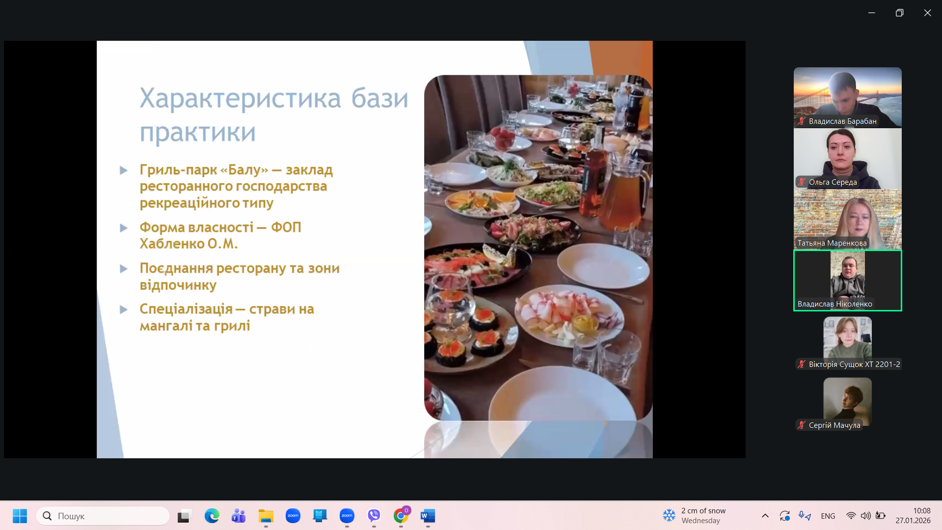 27 січня 2026 року на факультеті харчових технологій в онлайн-форматі відбувся захист звітів з переддипломної практики здобувачів вищої освіти 3 с.т. та 4 курсу освітнього ступеня «Бакалавр», які навчаються за освітньо-професійними програмами «Харчові технології», «Крафтові технології та гастрономічні інновації» та «Готельно-ресторанна справа».