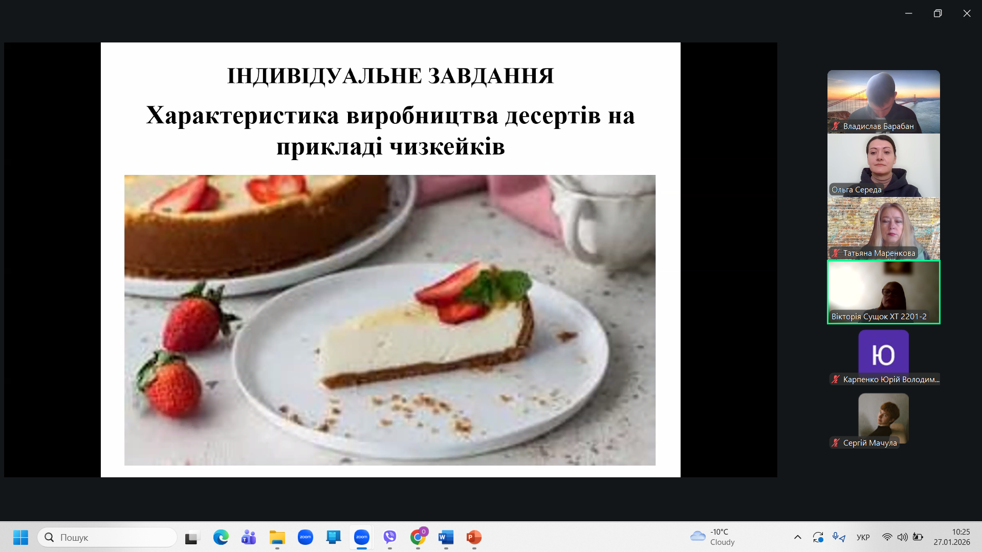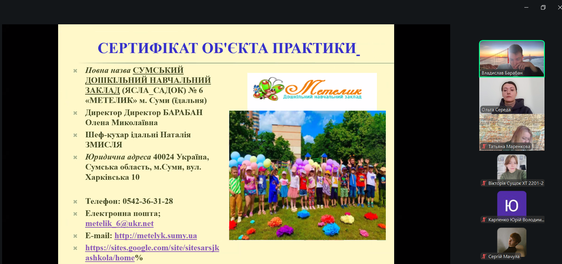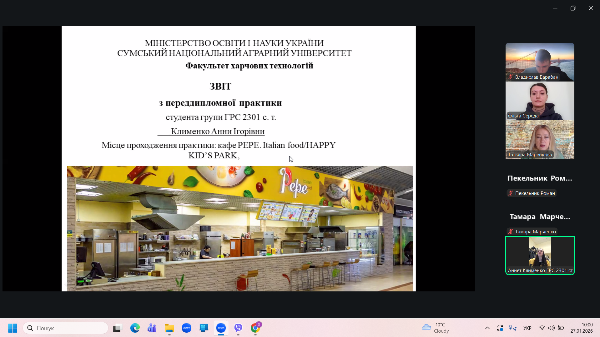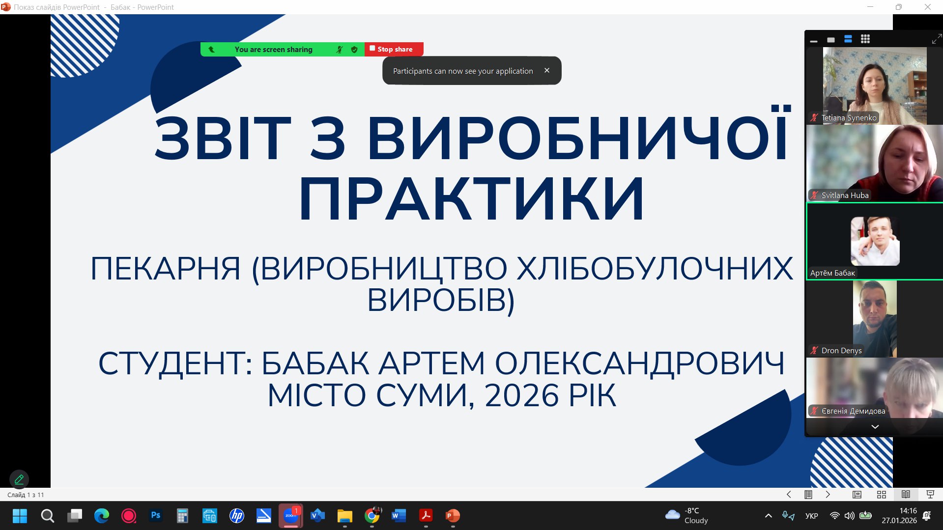 27 січня 2026 року на факультеті харчових технологій в онлайн-форматі відбувся захист звітів з переддипломної практики здобувачів вищої освіти 3 с.т. та 4 курсу освітнього ступеня «Бакалавр», які навчаються за освітньо-професійними програмами «Харчові технології», «Крафтові технології та гастрономічні інновації» та «Готельно-ресторанна справа».