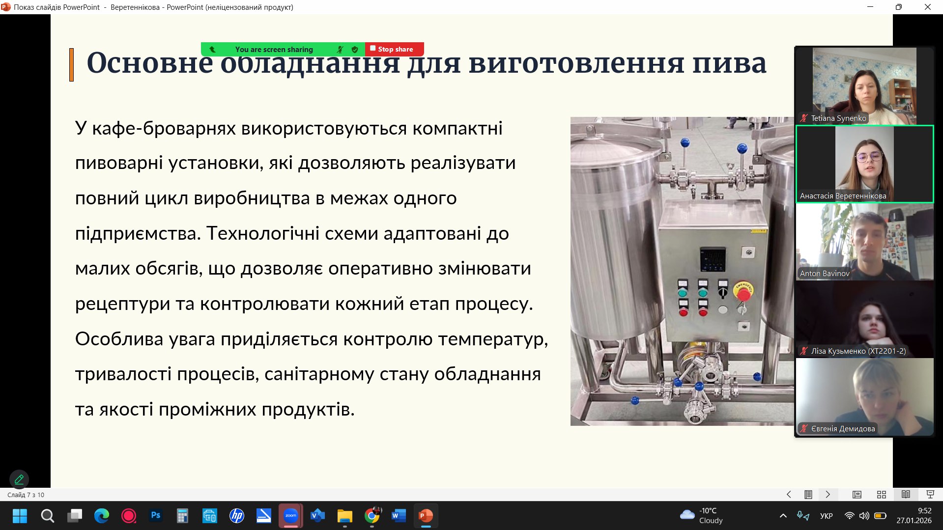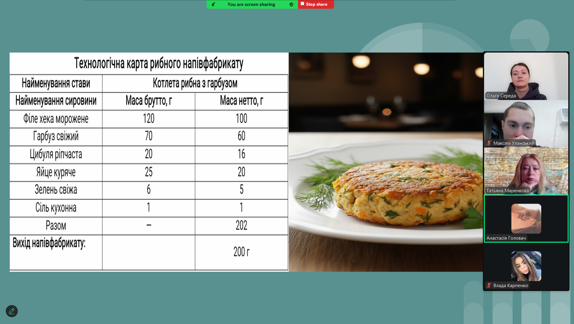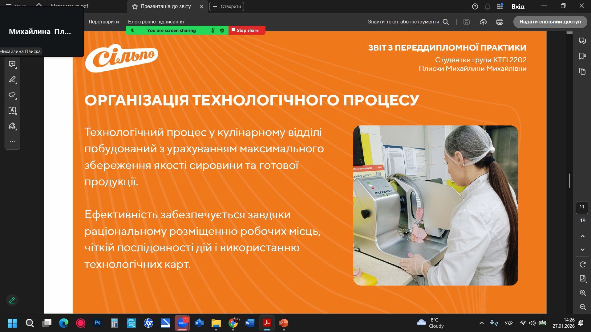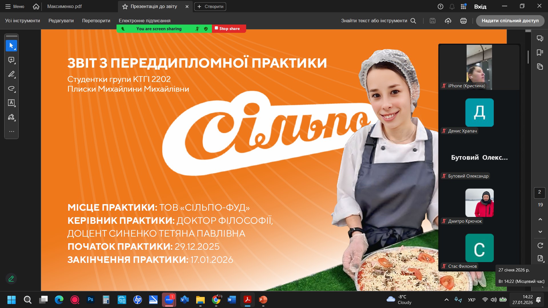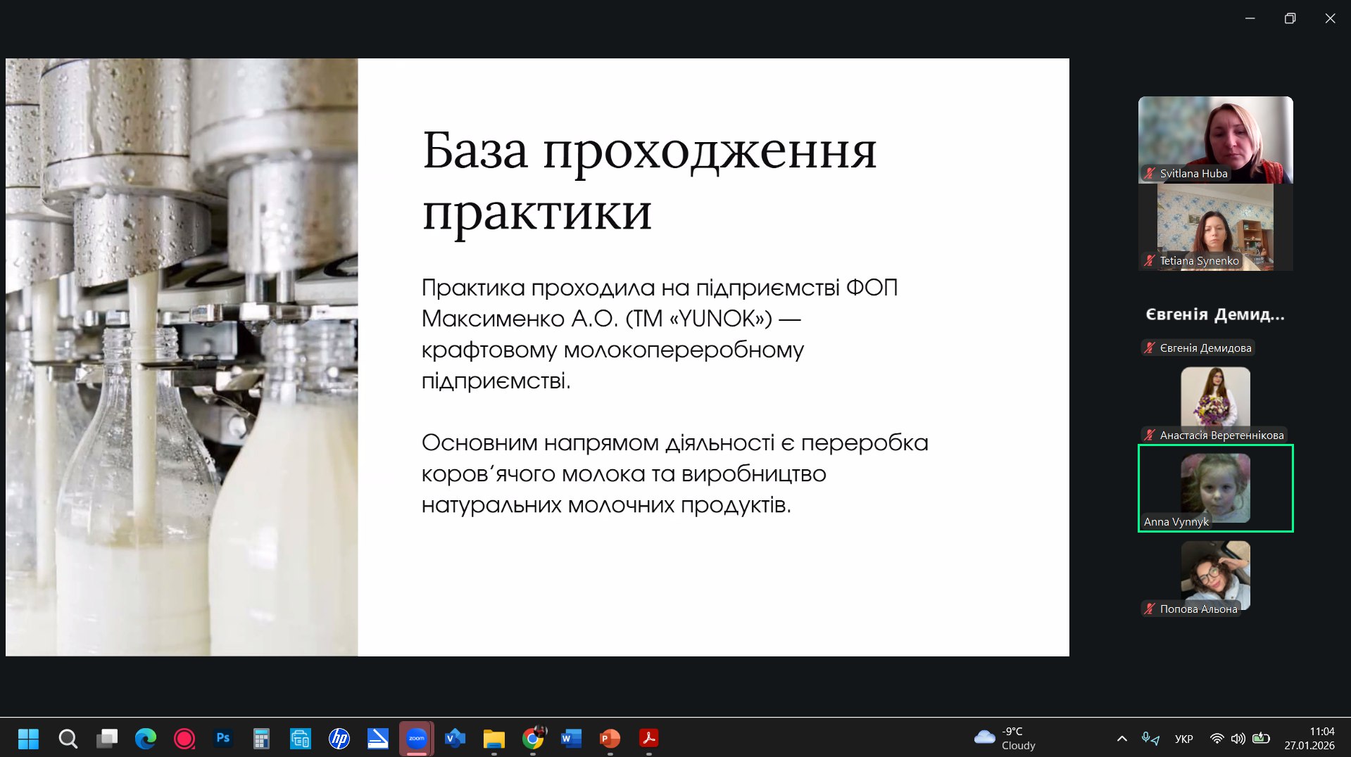 27 січня 2026 року на факультеті харчових технологій в онлайн-форматі відбувся захист звітів з переддипломної практики здобувачів вищої освіти 3 с.т. та 4 курсу освітнього ступеня «Бакалавр», які навчаються за освітньо-професійними програмами «Харчові технології», «Крафтові технології та гастрономічні інновації» та «Готельно-ресторанна справа».