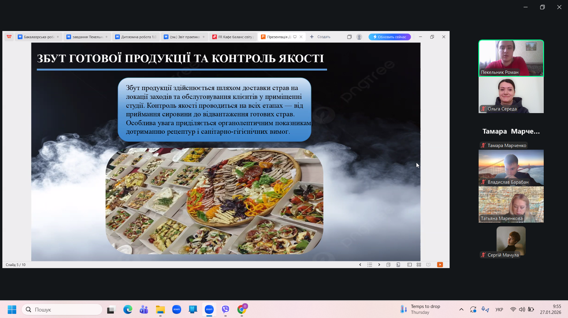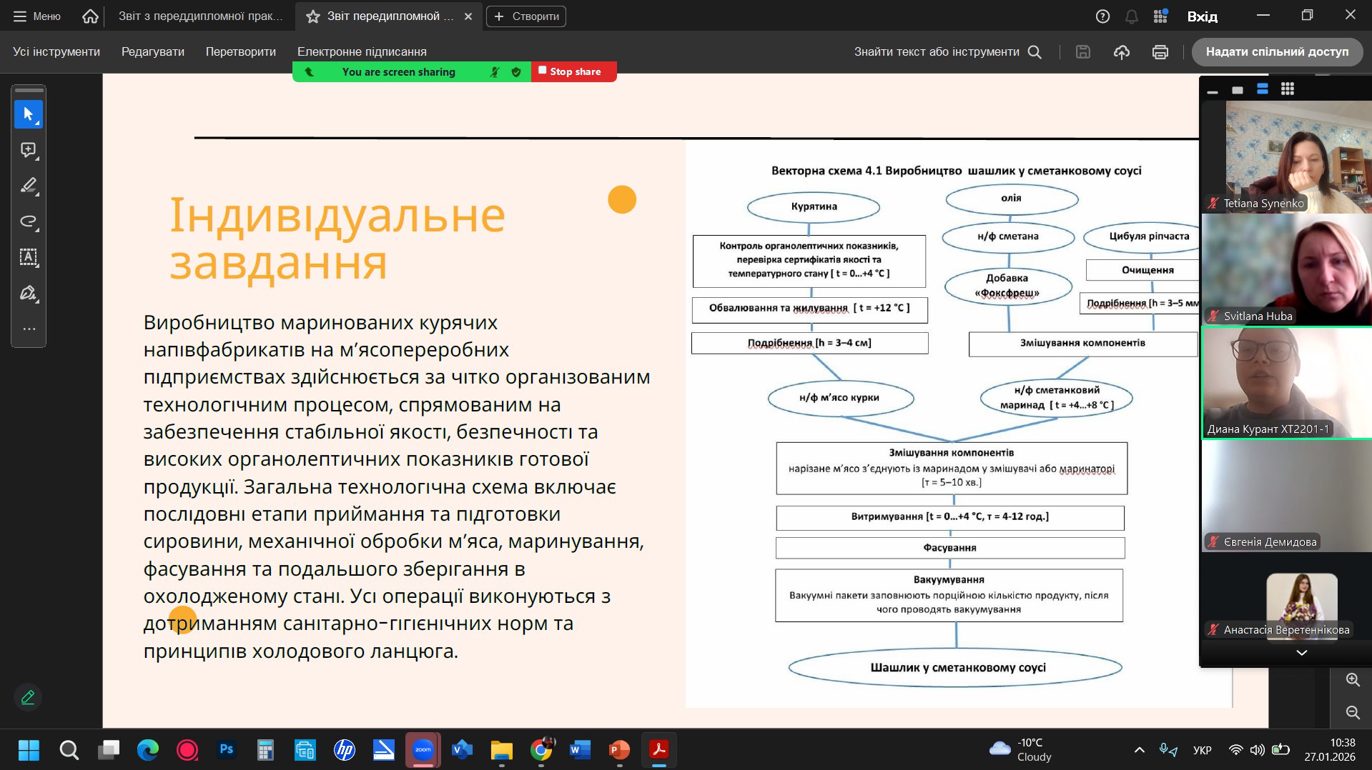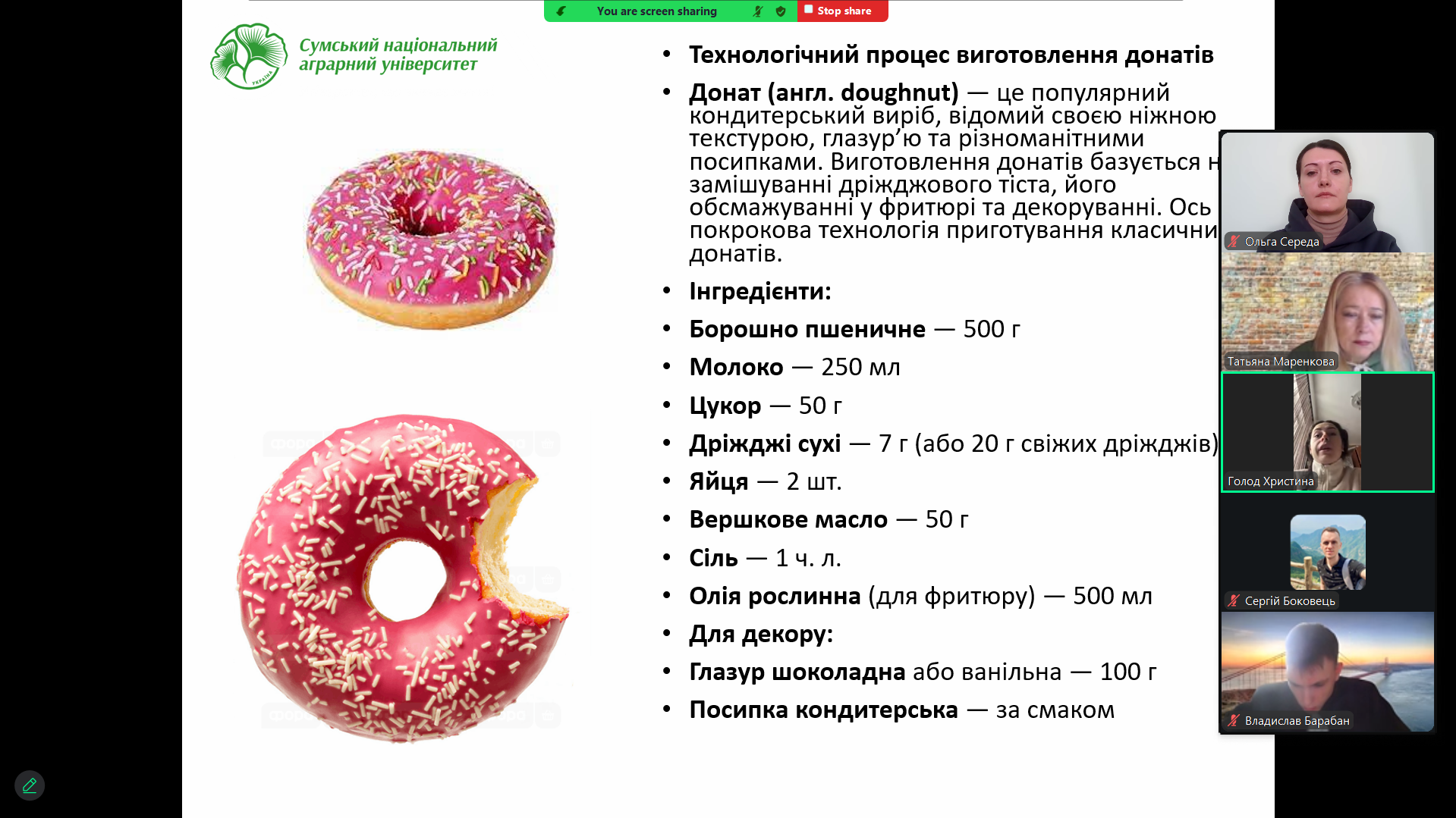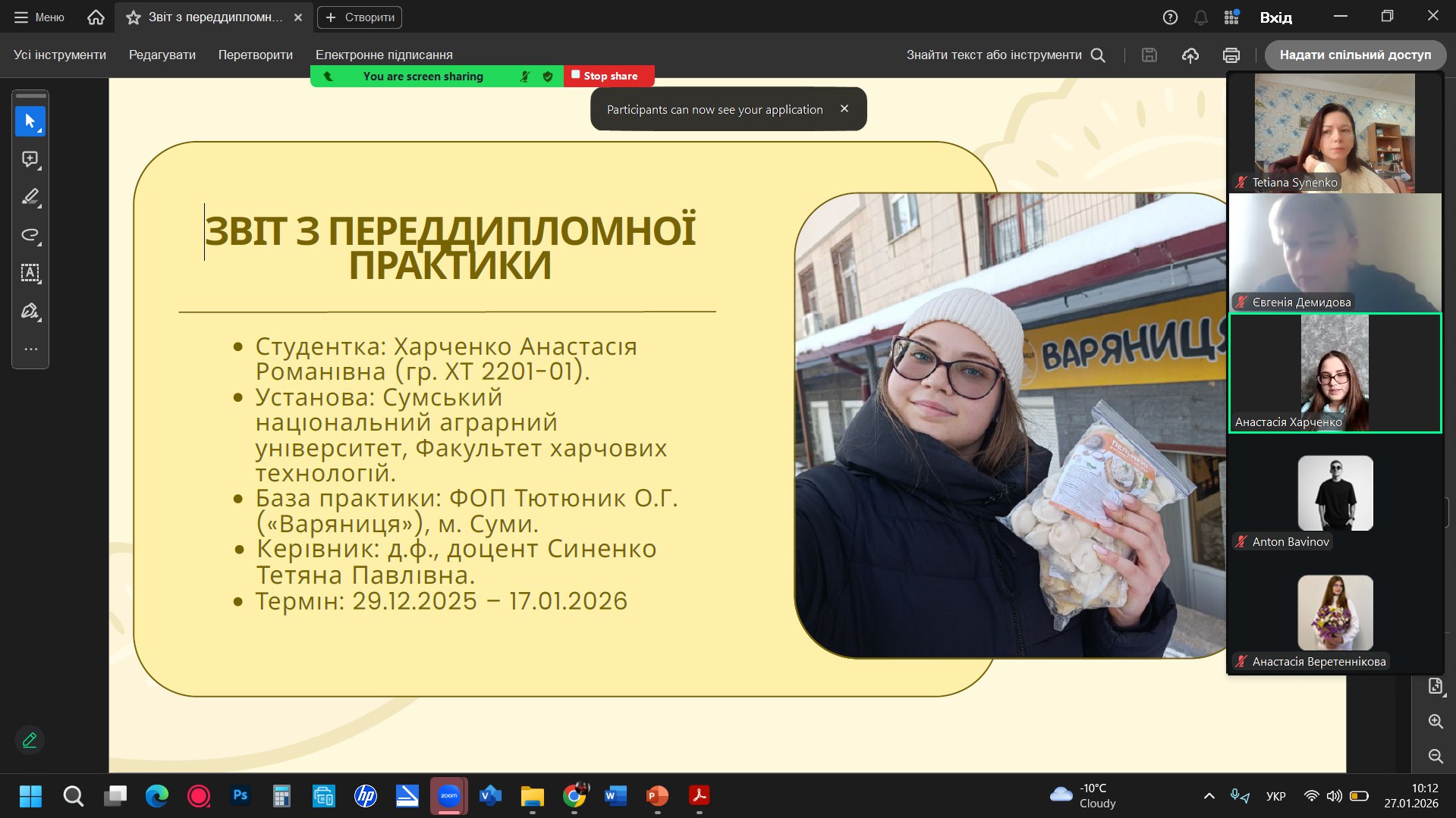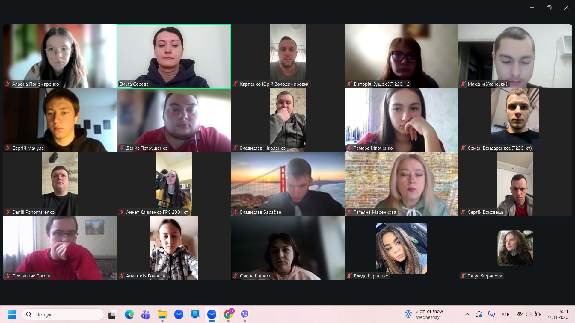 27 січня 2026 року на факультеті харчових технологій в онлайн-форматі відбувся захист звітів з переддипломної практики здобувачів вищої освіти 3 с.т. та 4 курсу освітнього ступеня «Бакалавр», які навчаються за освітньо-професійними програмами «Харчові технології», «Крафтові технології та гастрономічні інновації» та «Готельно-ресторанна справа».
