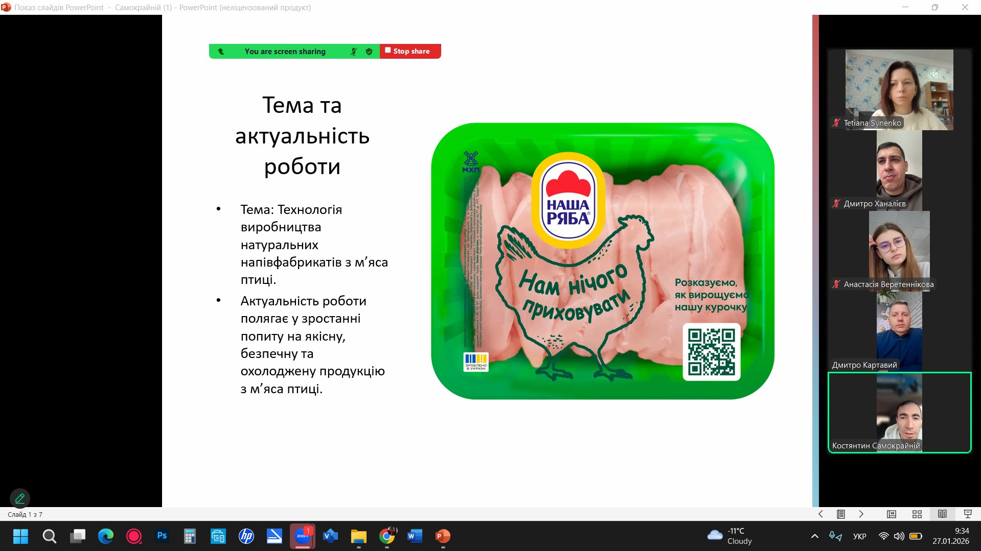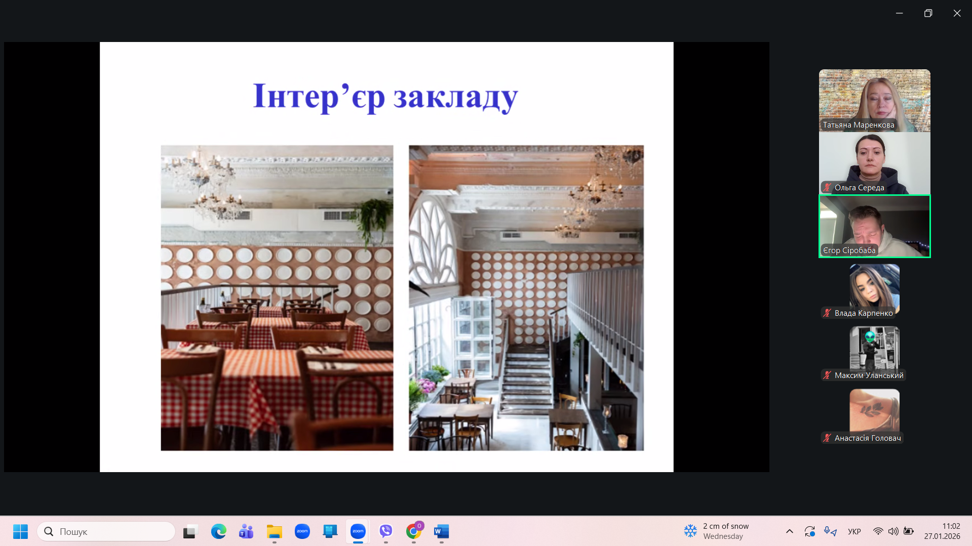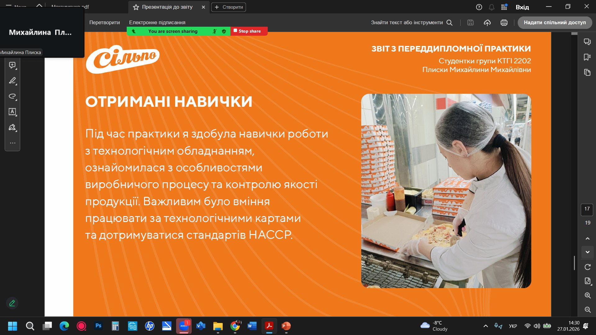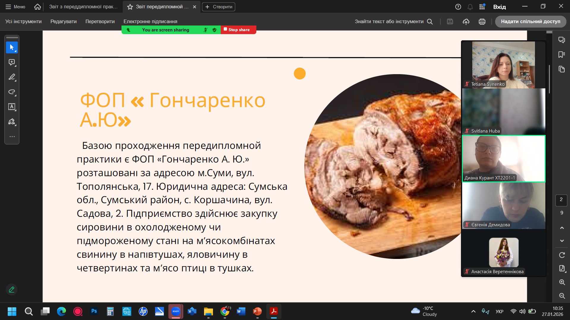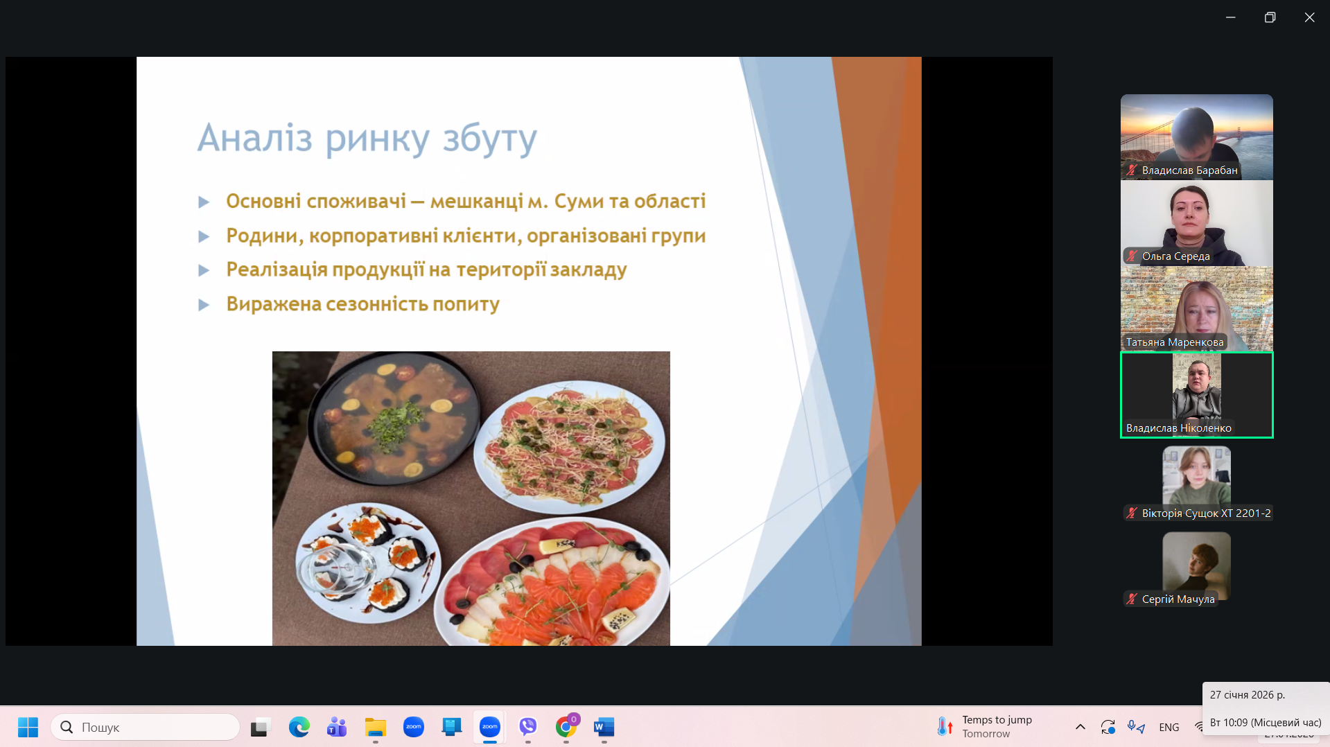 27 січня 2026 року на факультеті харчових технологій в онлайн-форматі відбувся захист звітів з переддипломної практики здобувачів вищої освіти 3 с.т. та 4 курсу освітнього ступеня «Бакалавр», які навчаються за освітньо-професійними програмами «Харчові технології», «Крафтові технології та гастрономічні інновації» та «Готельно-ресторанна справа».