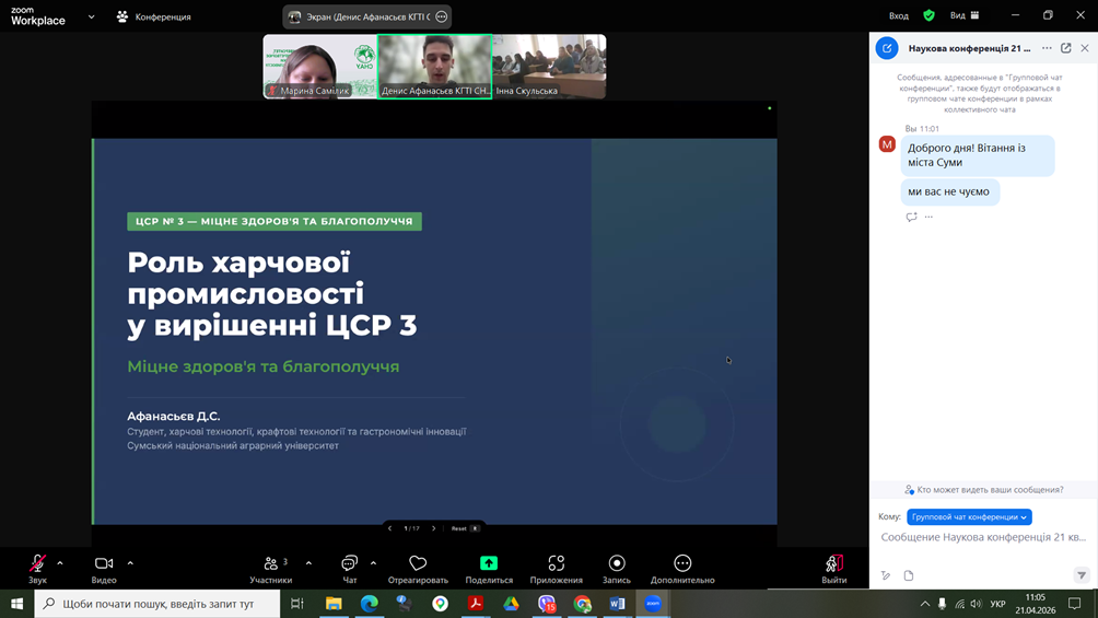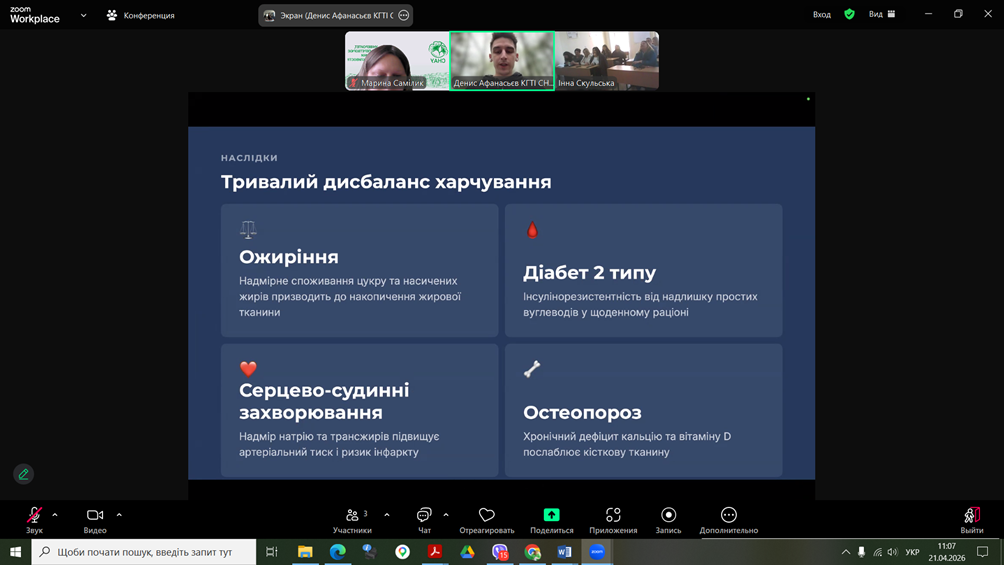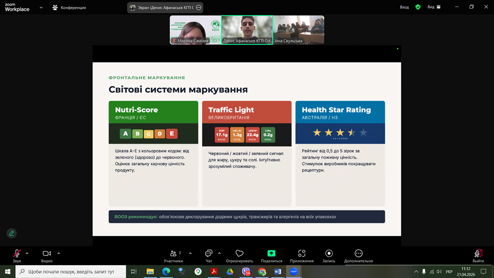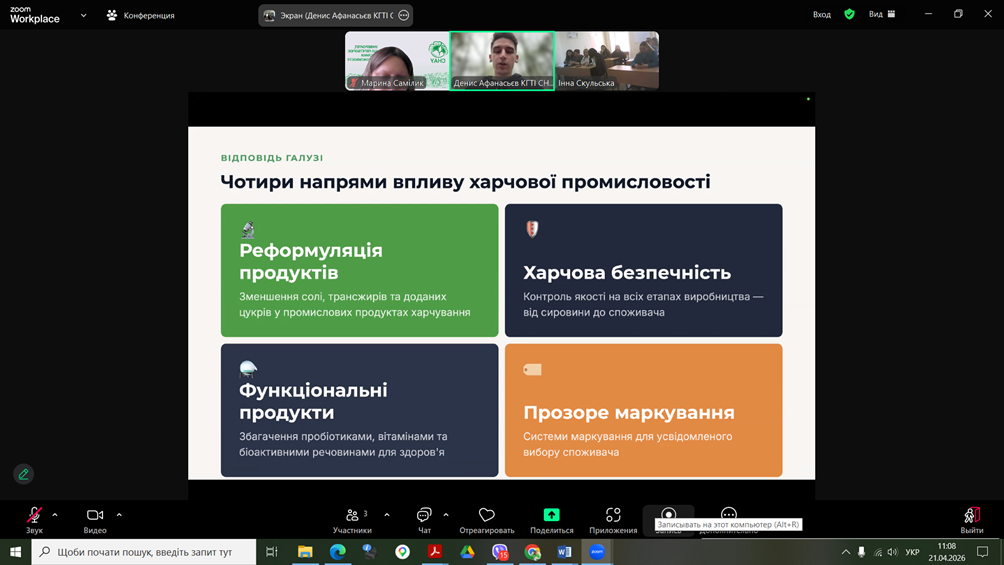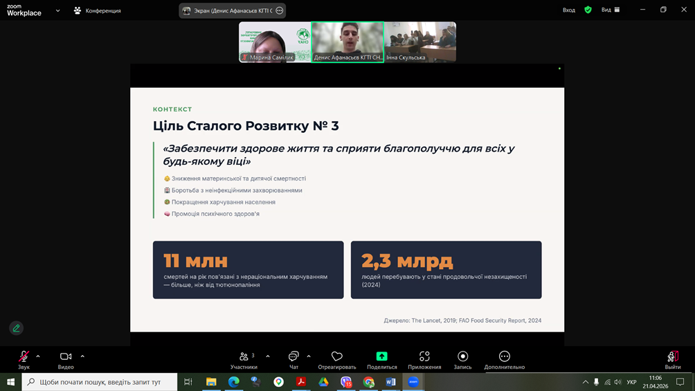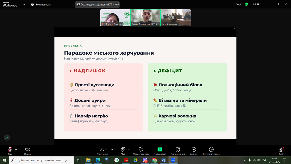 Здобувачі спеціальності G13 «Харчові технології» взяли участь у роботі конференції «Дні студентської науки у Львівському національному університеті ветеринарної медицини та біотехнологій імені С.З. Ґжицького», яка відбулася 21 квітня 2026 року у м.Львів. Учасники конференції розглядали проблеми галузі в напрямку технологій харчових виробництв та біотехнологій. Зокрема, Денис Афанасьєв, здобувач ОПП «Крафтові технології та гастрономічні інновації», виступив з доповіддю «РОЛЬ ХАРЧОВОЇ ПРОМИСЛОВОСТІ У ВИРІШЕННІ ТРЕТЬОЇ ЦІЛІ СТАЛОГО РОЗВИТКУ: МІЦНЕ ЗДОРОВ’Я ТА БЛАГОПОЛУЧЧЯ». Харчова промисловість є важливим важелем впливу у формуванні здорового способу життя. Зокрема, через реформацію продуктів, харчову безпечність, створення функціональних продуктів та прозорість маркування. Здобувачі спеціальності G13 «Харчові технології» взяли участь у роботі конференції «Дні студентської науки у Львівському національному університеті ветеринарної медицини та біотехнологій імені С.З. Ґжицького», яка відбулася 21 квітня 2026 року у м.Львів. Учасники конференції розглядали проблеми галузі в напрямку технологій харчових виробництв та біотехнологій. Зокрема, Денис Афанасьєв, здобувач ОПП «Крафтові технології та гастрономічні інновації», виступив з доповіддю «РОЛЬ ХАРЧОВОЇ ПРОМИСЛОВОСТІ У ВИРІШЕННІ ТРЕТЬОЇ ЦІЛІ СТАЛОГО РОЗВИТКУ: МІЦНЕ ЗДОРОВ’Я ТА БЛАГОПОЛУЧЧЯ». Харчова промисловість є важливим важелем впливу у формуванні здорового способу життя. Зокрема, через реформацію продуктів, харчову безпечність, створення функціональних продуктів та прозорість маркування.