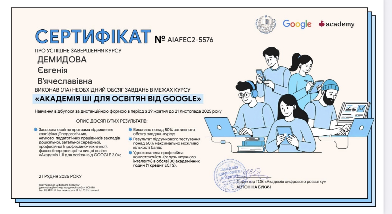 цифрових технологій в освітньому процесі, включно з електронним навчанням, інформаційною та кібернетичною безпекою (відповідно до постанови КМУ No800 від 21.08.2019)” в рамках онлайн-курсу “Академія ШІ для освітян від Google”, організованого у співпраці з Міністерством освіти і науки України та Beetroot Academy.