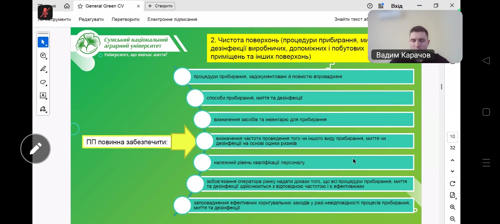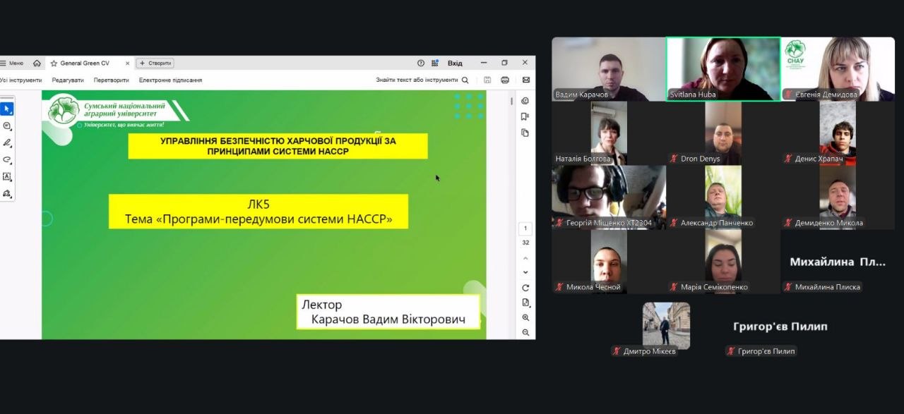 Тема лекції — «Програми-передумови системи HACCP». Захід відбувся 7 квітня 2026 року та був присвячений актуальним питанням забезпечення безпечності харчових продуктів. Під час заняття було розглянуто ключові аспекти, зокрема: безпечність води, льоду та допоміжних матеріалів, а також забезпечення належної чистоти поверхонь у виробничих умовах.