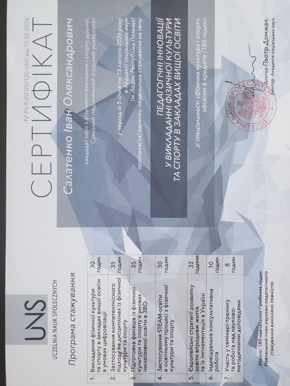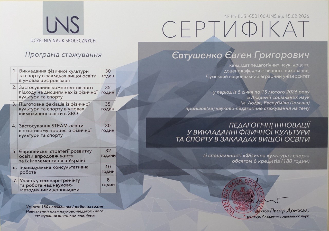 Стажування проходило в Академії соціальних наук (м. Лодзь, Польща) у період з 5 січня по 15 лютого 2026 року на тему «Педагогічні інновації у викладанні фізичної культури та спорту в закладах вищої освіти».