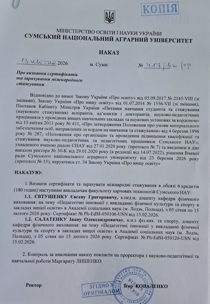 Відповідно до наказу Сумського національного аграрного університету від 13 квітня 2026 року № 447/вк/тр, ухваленого на підставі рішення Вченої ради, здійснено визнання сертифікатів та зарахування результатів міжнародного стажування викладачів факультету харчових технологій.