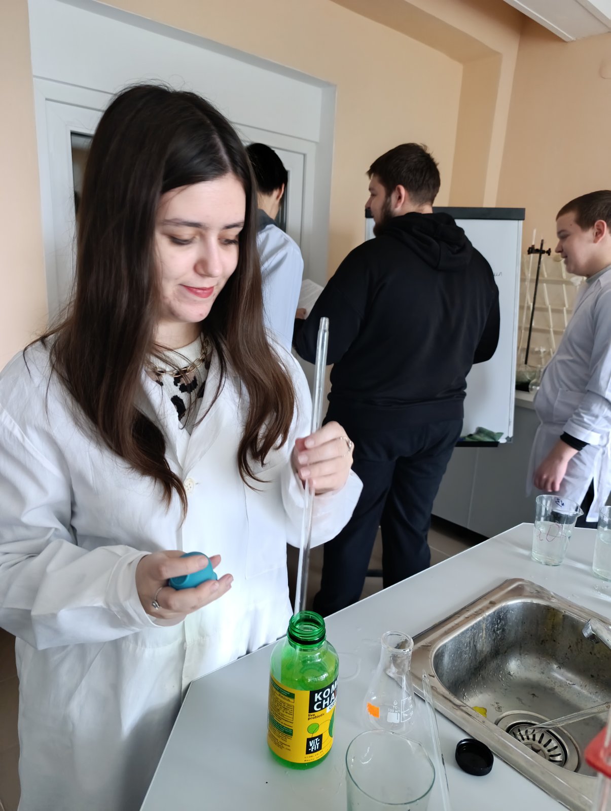 Під керівництвом к.т.н., доцента Вікторії Івченко першокурсники досліджували показники якості безалкогольного напою комбуча та пива «Охтирське світле». Під час заняття вони визначали піностійкість і піноутворення, вимірювали густину та вміст сухих речовин, проводили титрування для оцінки кислотності, рефрактометрично встановлювали кількість цукру в продуктах, а також визначали їх кольоровість фотоколориметричним методом.